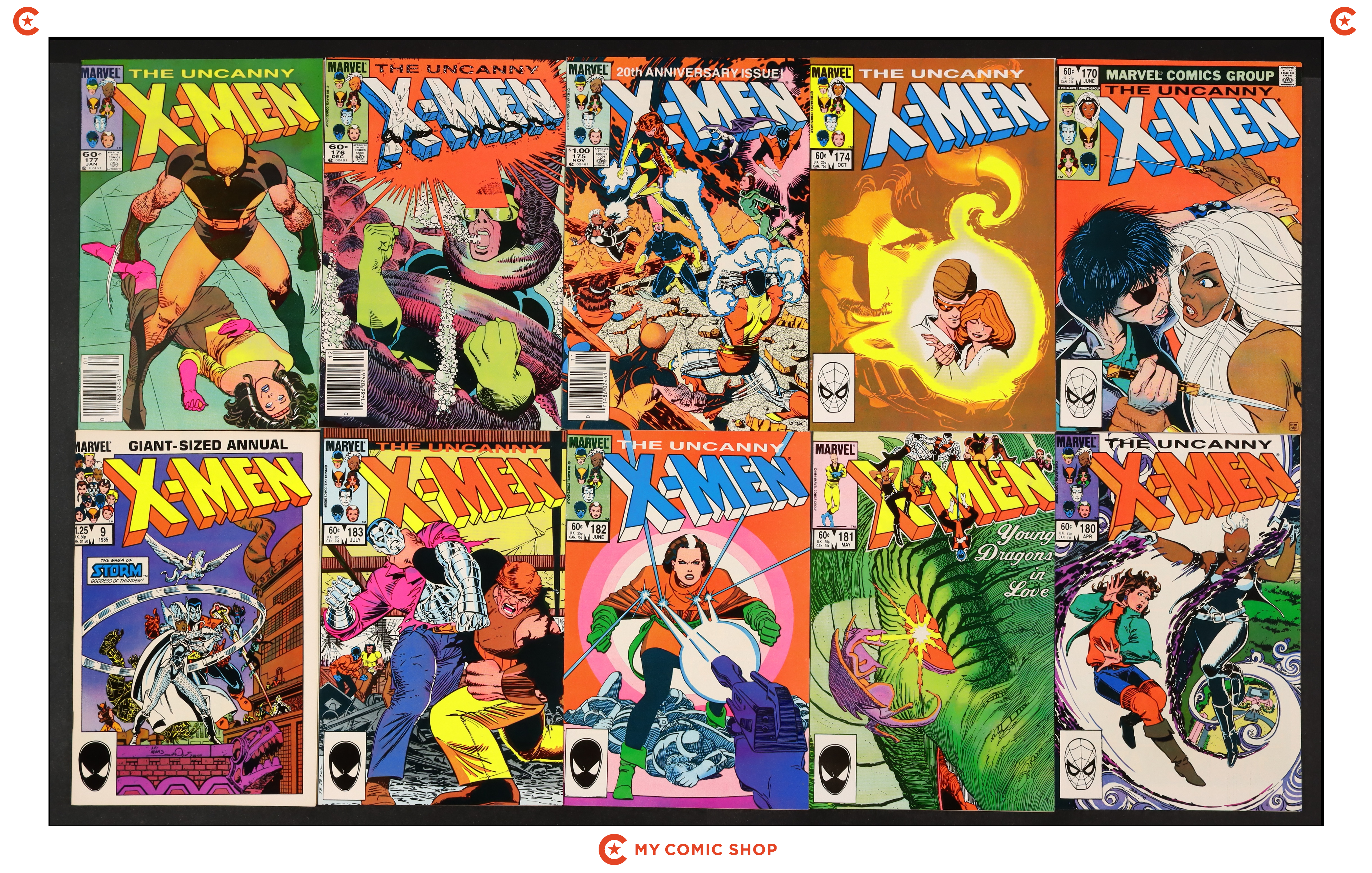 Issues 170D, 174, 175N, 176N, 177N, 180, 181D, 182, 183D, and annual 9 of Uncanny X-Men (1963 1st Series). Most will grade in the FN to VF range.