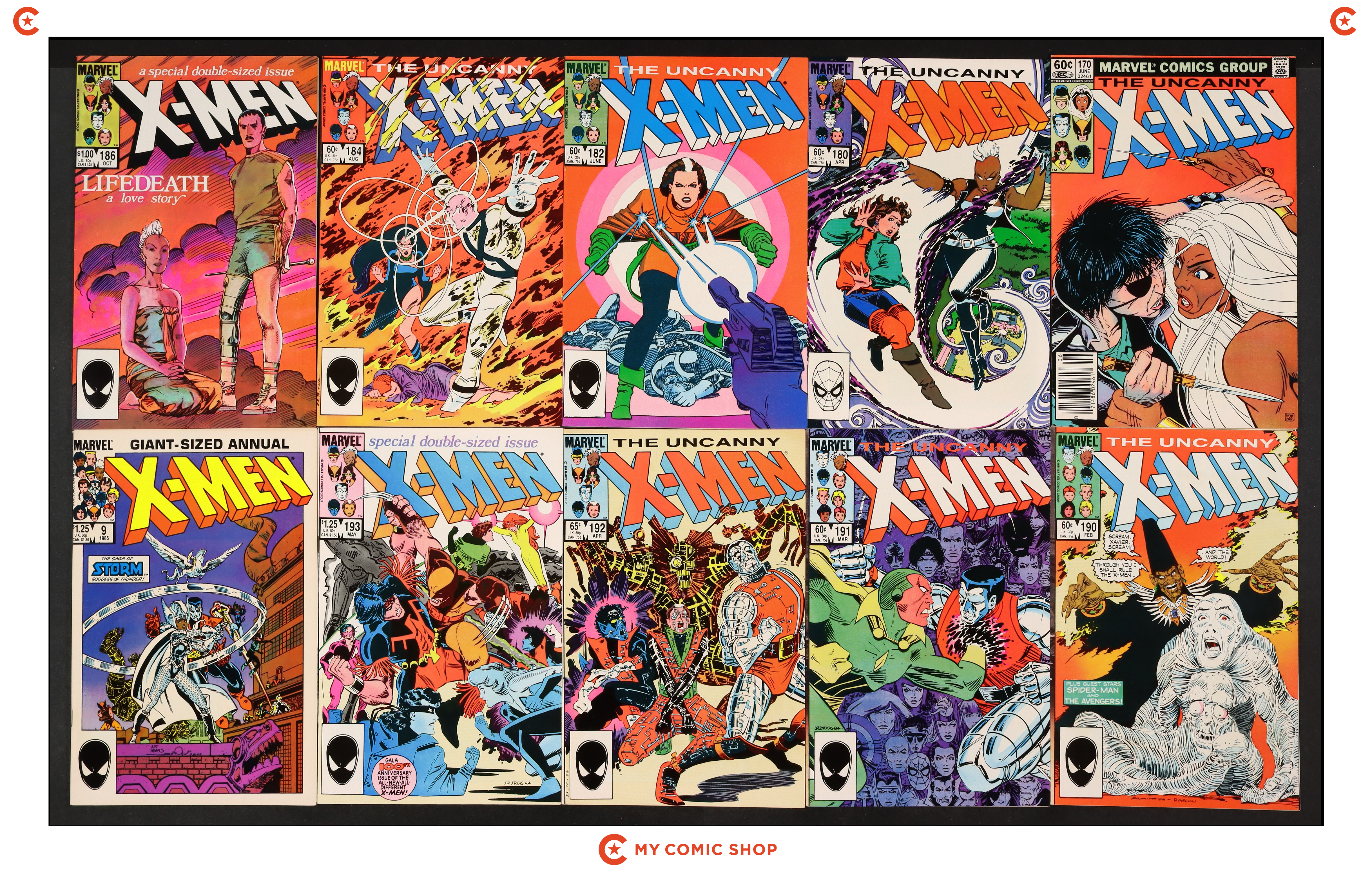 Issues 170N, 180, 182, 184D, 186D, 190D, 191D, 192D, 193D, and annual 9D of Uncanny X-Men (1963 1st Series). Most will grade in the FN to VF range.