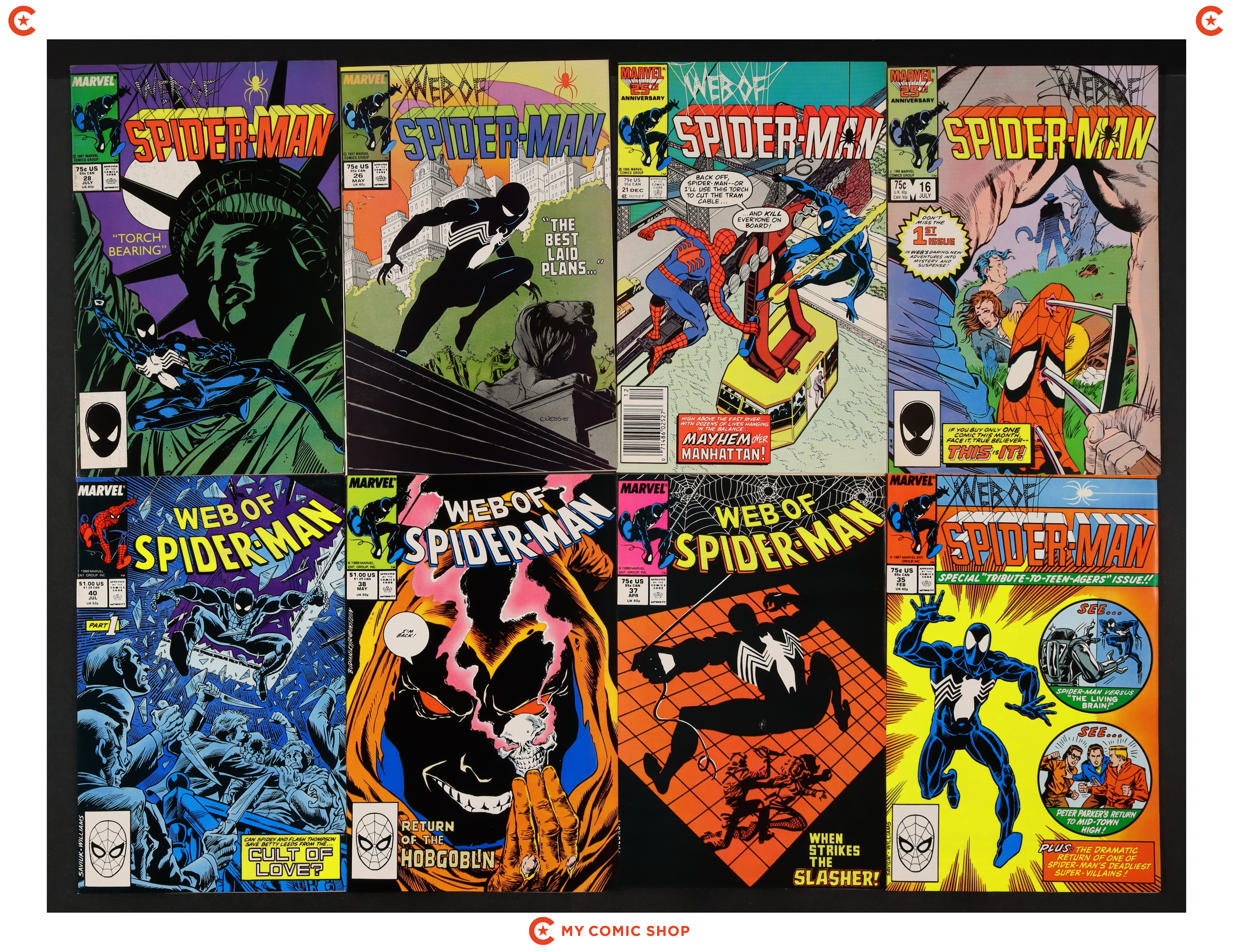 Issues 16, 21N, 26, 28, 35, 37, 38, and 40 of Web of Spider-Man (1985 1st Series). Most will grade in the VF to FN range.