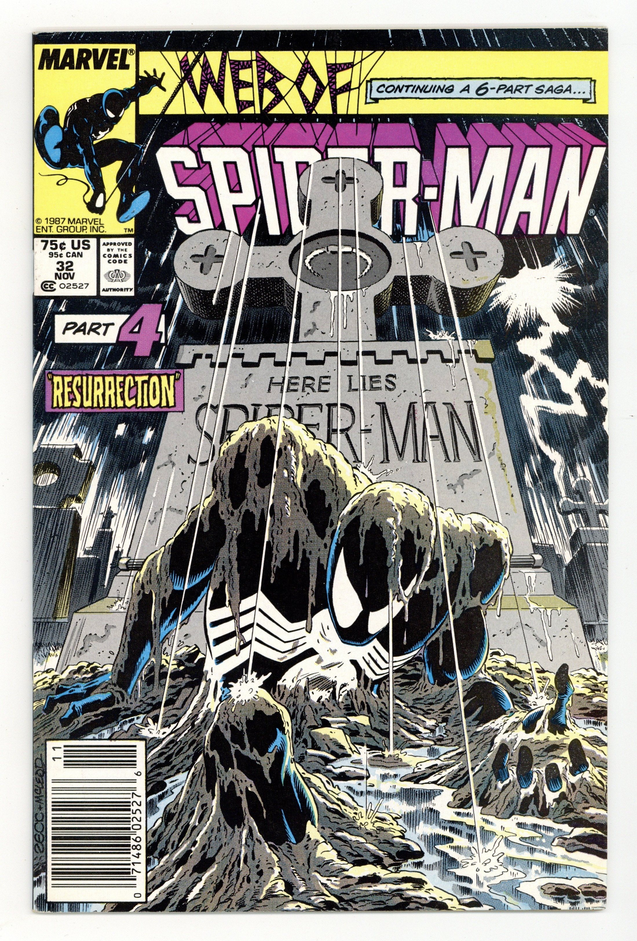 Starts Feb 16 Mark Jeweler Advertisement Insert Variant. Kraven's Last Hunt - Part 4 of 6 - "Resurrection" Story by J. M. DeMatteis. Art by Mike Zeck and Bob McLeod. Story continues from Spectacular Spiderman 131. Spider-Man finally awakens from his drug-induced coma and busts out of his coffin! Peter quickly returns to his wife, Mary Jane, who has not seen him in two weeks. Meanwhile, Kraven has been committing crimes in New York City, while dressed as Spider-Man. Story continues in Amazing Spiderman 294. 32 pages Cover price $0.75.