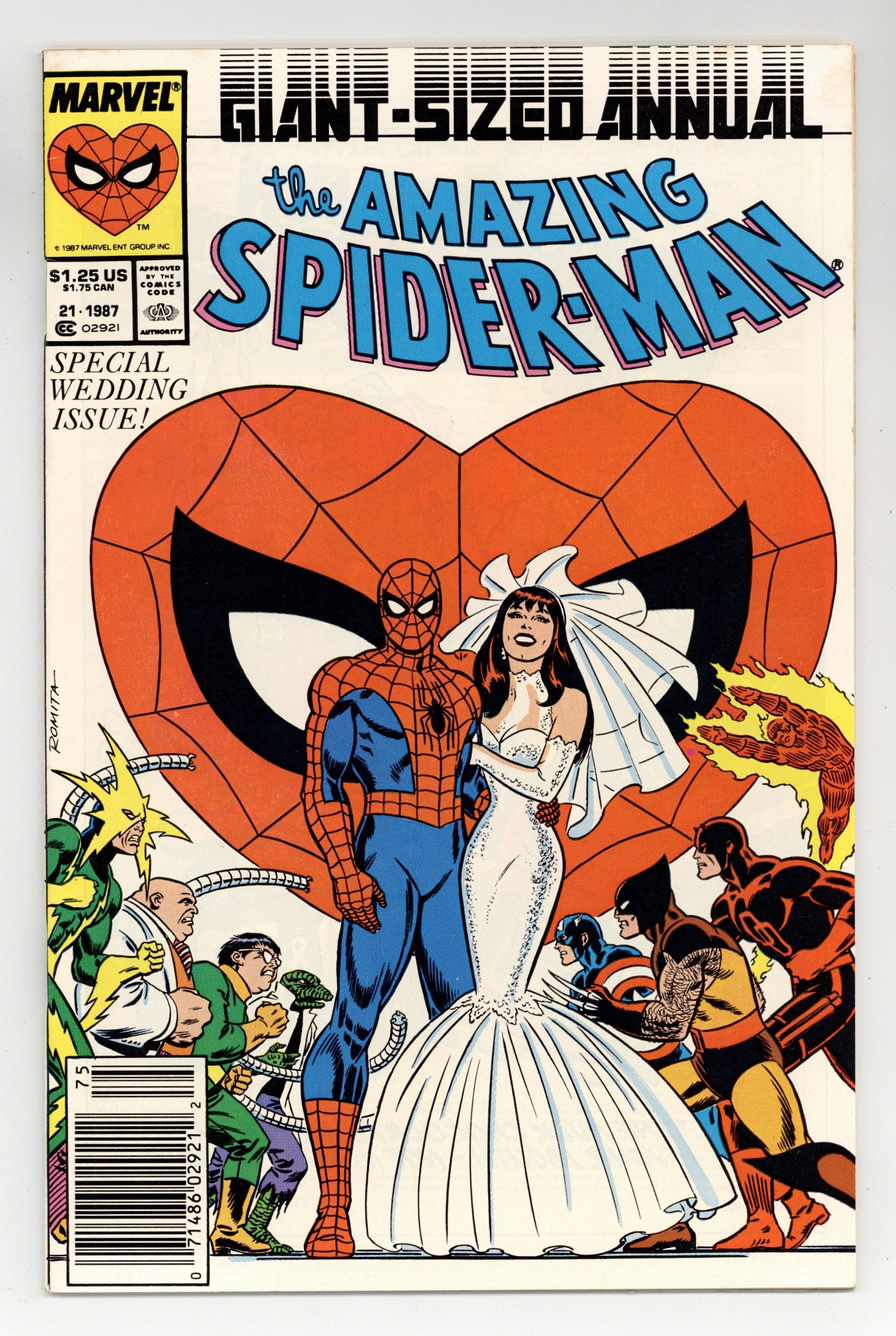 Starts Dec 22 Newsstand Edition. The marriage of Peter Parker and Mary Jane Watson in "The Wedding." Plot by Jim Shooter. Script by David Michelinie. Pencils by Paul Ryan. Inks by Vince Colletta. Cover by John Romita Sr. Newsstand Edition. At long last wedding bells ring for Peter Parker and Mary Jane Watson! What an exciting day! The blushing bride will need something old, something new, something borrowed, and something blue! While the Amazing Spider-Man will need to take care of two things before the big day! First, the easy task...short circuit Electro's latest scheme! And second, the tough one...put the memory and heartache of Gwen Stacy in the past forever. Will another trip to the Brooklyn Bridge bring peace to the wondrous wall-crawler? Or will the ghosts of days gone by derail a bright future with Mary Jane? Carpe diem, web-slinger! Appearances by Flash Thompson, Harry Osborn, Liz Osborn, Betty Leeds, Aunt May, Anna Watson, Joe Robertson, J. Jonah Jameson, and Willi Smith. Flashback cameos by the Green Goblin, Gwen Stacy, and Uncle Ben. (Notes: Peter and Mary Jane go on their honeymoon in Spectacular Spider-Man Annual 7. The Direct Edition cover features Peter Parker's friends and family. The Newsstand Edition depicts Spider-Man's friends and foes. Amazing Spider-Man Annual 21 was one of the first issues Marvel published with two different covers. This story was reprinted in the 1991 trade paperback: the Amazing Spider-Man - The Wedding.) 52 pages. Cover price $1.25.