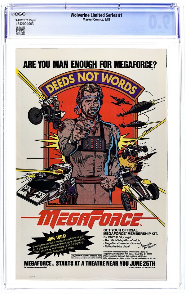 Starts Apr 4 Direct Edition. 1 of 4 Featuring Wolverine in his first solo series fighting in Japan. "Wolverine." Script by Chris Claremont, pencils by Frank Miller, inks by Joe Rubinstein. Miller/Rubinstein cover. Back cover MegaForce ad with art by William Stout. Cover price $0.60.