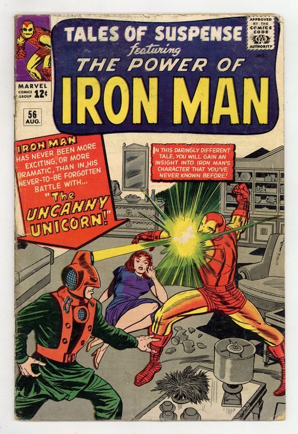 Starts Feb 2 Cover pencils by Jack Kirby, inks by Dick Ayers. First appearance of the Unicorn in "The Uncanny Unicorn!", script by Stan Lee, art by Don Heck; A Soviet agent with high-tech armor comes to the US to capture Iron Man; He kidnaps Pepper and injures Happy to draw Iron Man out, and then threatens to blow up Stark's factory unless Iron Man comes with him; Iron Man boards Unicorn's plane, but then destroys it, though the Unicorn escapes; Thor, Wasp, and Giant-Man cameos; Part of this story continues in Avengers #7. "Pouf!" text story. "The Watcher's Sacrifice!", script by Stan Lee (plot) and Larry Lieber (script), pencils by Larry Lieber, inks by George Roussos (as George Bell); The Watcher falls in love with a courageous alien queen, but his duty forces him to leave her. 36 pages, full color. Cover price $0.12.