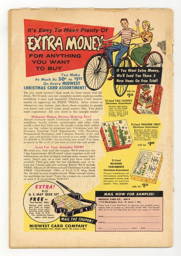 Ends Mar 2 9:31 PM CST Bid History no bids Minimum Bid $1 Your Secret Max Bid If you'd like to bid, please log in or register. Cover pencils by Wayne Boring, inks by Stan Kaye. Superman For Sale starring Superman, Henry Drebbin, Edward Jorgens, and Paul Quillan, script by Bill Finger, pencils by Wayne Boring, inks by Stan Kaye. The Midget Menace starring Superman and The Thurans, script by Edmond Hamilton, pencils by Wayne Boring, inks by Stan Kaye; Superman is tied down like Gulliver. The Best Present Of All! public service announcement starring Binky, script by Jack Schiff, art by Win Mortimer. Rocket To The Sky text story. The Million Dollar Mistake starring Superman and Soapy Martin, art by Al Plastino. CinemaAntics humor half-page by Harry Lampert. A two-page ad features Superman products available for Christmas. Fearless Fosdick stars in a quarter-page ad for Wildroot Cream-Oil with art by Al Capp. 36 Pages, Full Color. Cover price $0.10.