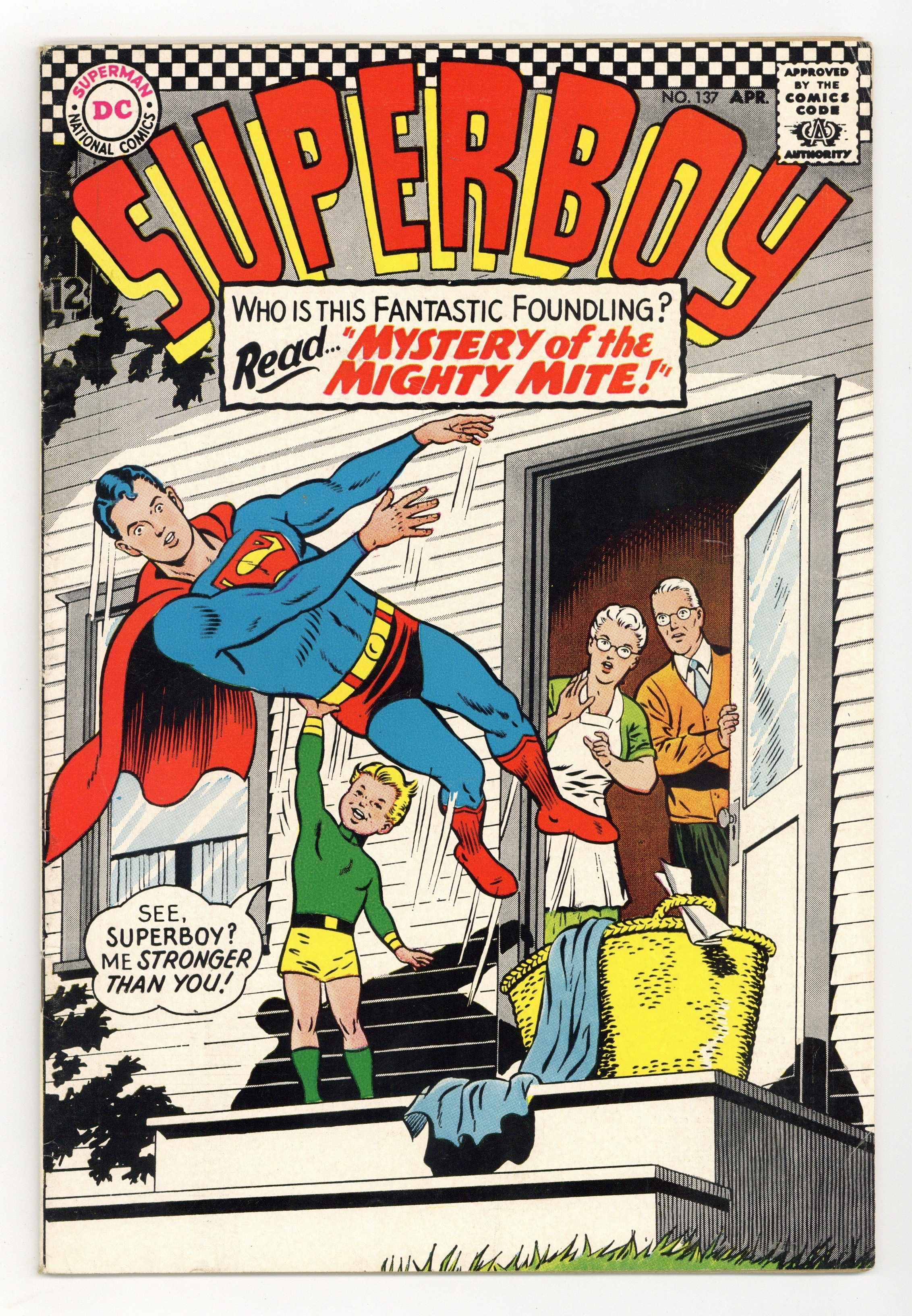 Starts Mar 2 Cover art by Curt Swan, inks by George Klein. Superboy's Blind Identity!, script by E. Nelson Bridwell, art by Al Plastino; Circumstances force the Kents to adopt new identities; Ma and Pa become John and Margret Kendall and Clark becomes blind Chuck Kendall. The Mysterious Mighty Mite!, script by Leo Dorfman, pencils by George Papp, inks by Chic Stone; someone leaves a Kryptonian baby on the Kent's doorstep. 36 Pages, Full Color. Cover price $0.12.