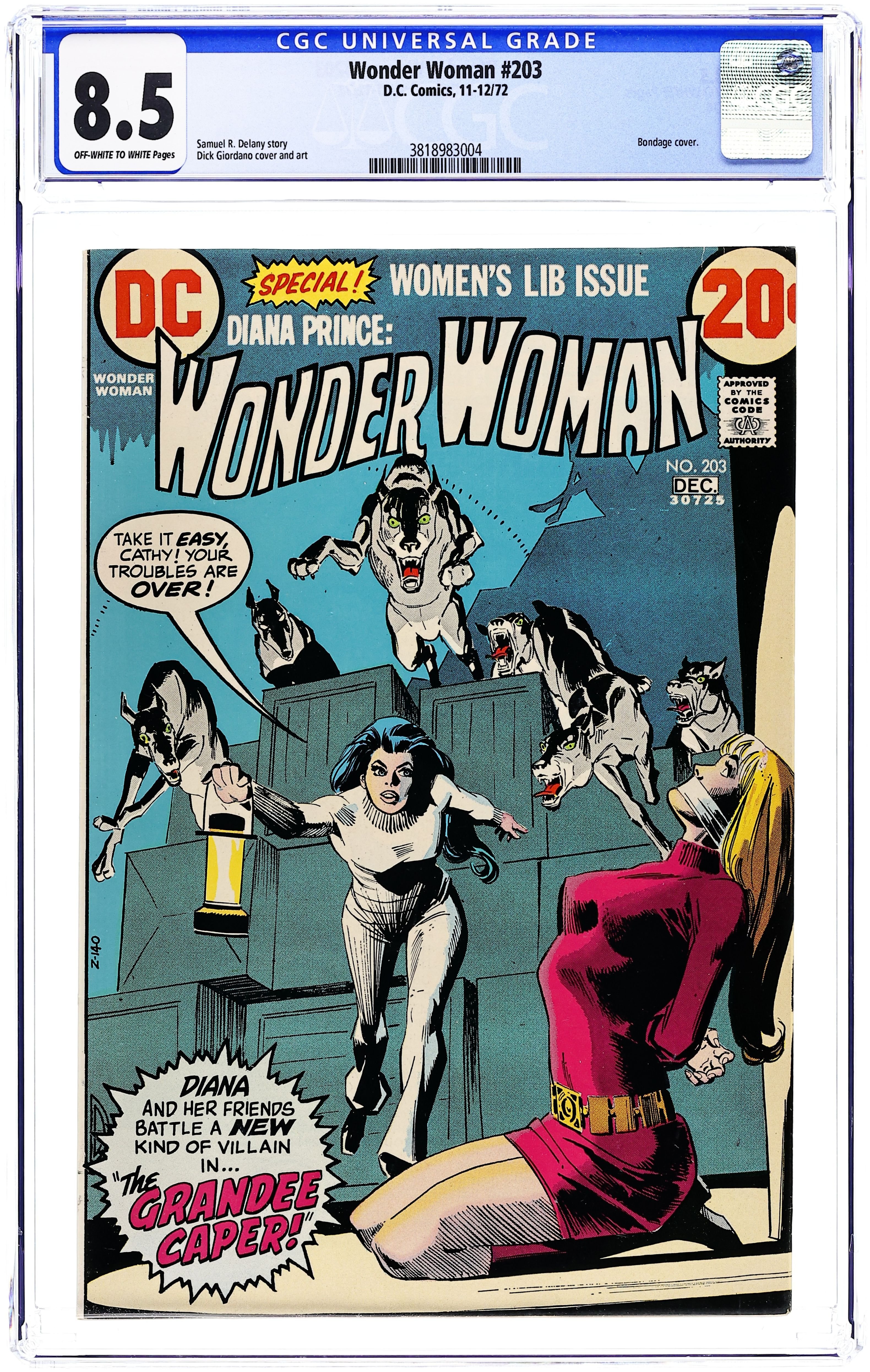 Starts May 18 Cover by Dick Giordano. Womens lib story "The Grandee Caper," script by Samuel R. Delany, art by Dick Giordano; After Cathy Perkins starts a fight with some wolfish "admirers" of Diana (and Diana ends it), the now-homeless Diana moves in with her former assistant, whom she learns is now enrolled in a womens liberation group and is taking karate lessons; Diana is offered a job at Grandees Department Store by Mr. Grandee, its owner, who wishes to pay her big bucks for appearing in ads for his store as the symbol of the new liberated woman. 36 pages, Full Color. Cover price $0.20.
