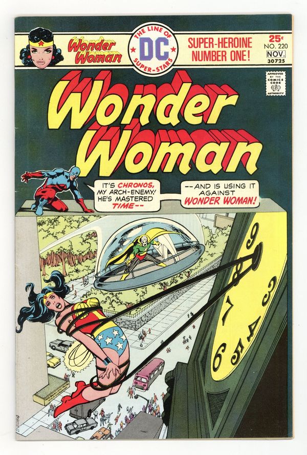 Starts Apr 27 Cover pencils by Dick Giordano, inks by Dick Giordano and Terry Austin. "The Man Who Wiped Out Time!", script by Martin Pasko, art by Dick Giordano, Neal Adams, and Terry Austin; Atom and Hawkman compete to observe Wonder Woman's 10th mission, with Atom apparently winning, as he observes Diana's battle against Chronos. Brief Justice League of America appearance. Captain Marvel stars in a one-page Hostess ad, "Minerva Menace!" 36 pages, Full Color. Cover price $0.25.