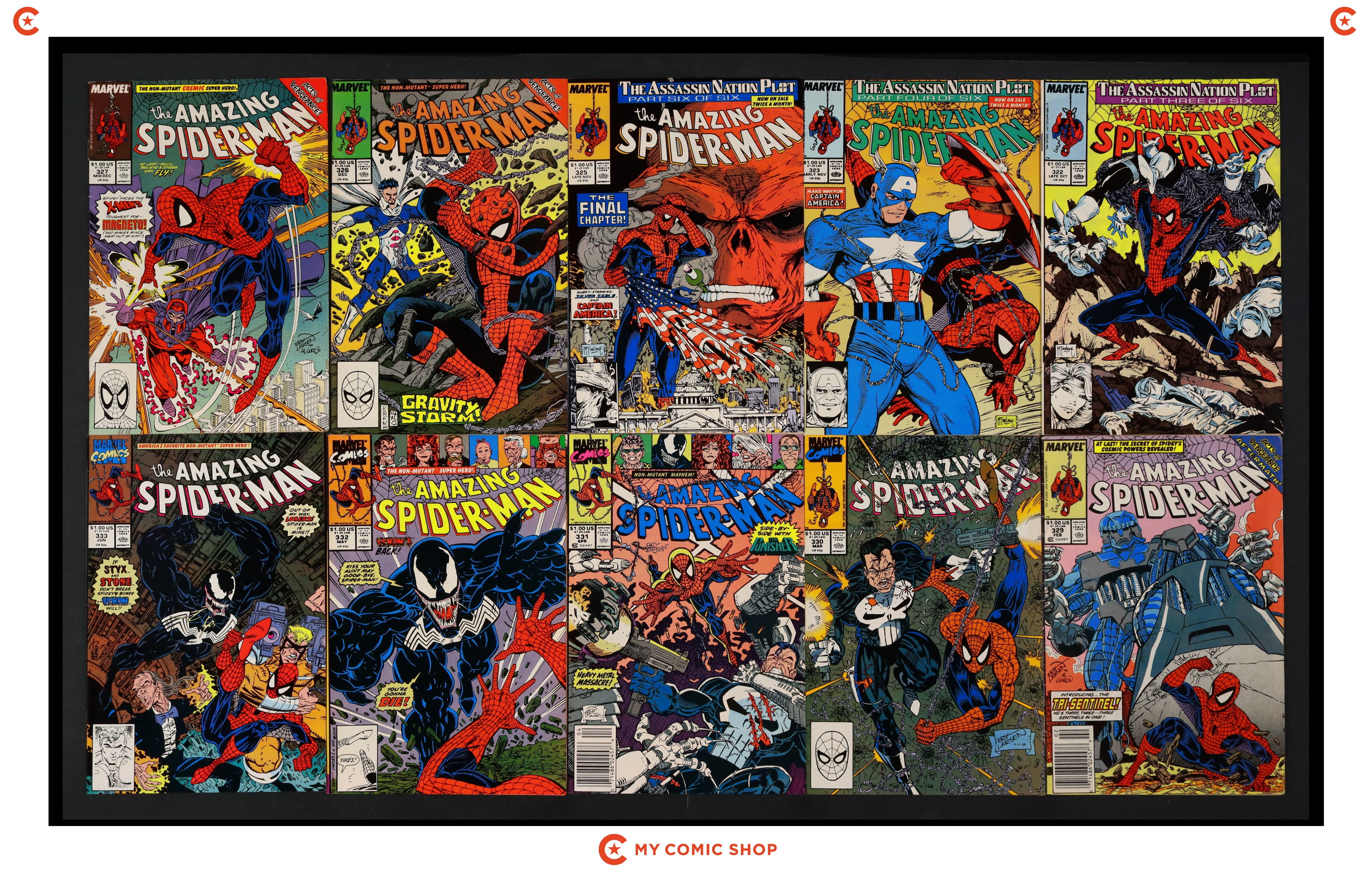 Issues 322, 323, 325, 326D, 327D, 329, 330D, 331N, 332N, 333D of Amazing Spider-Man (1963 1st Series). Most will grade in the FN to VF range, with 327 and 329 grading at GD.