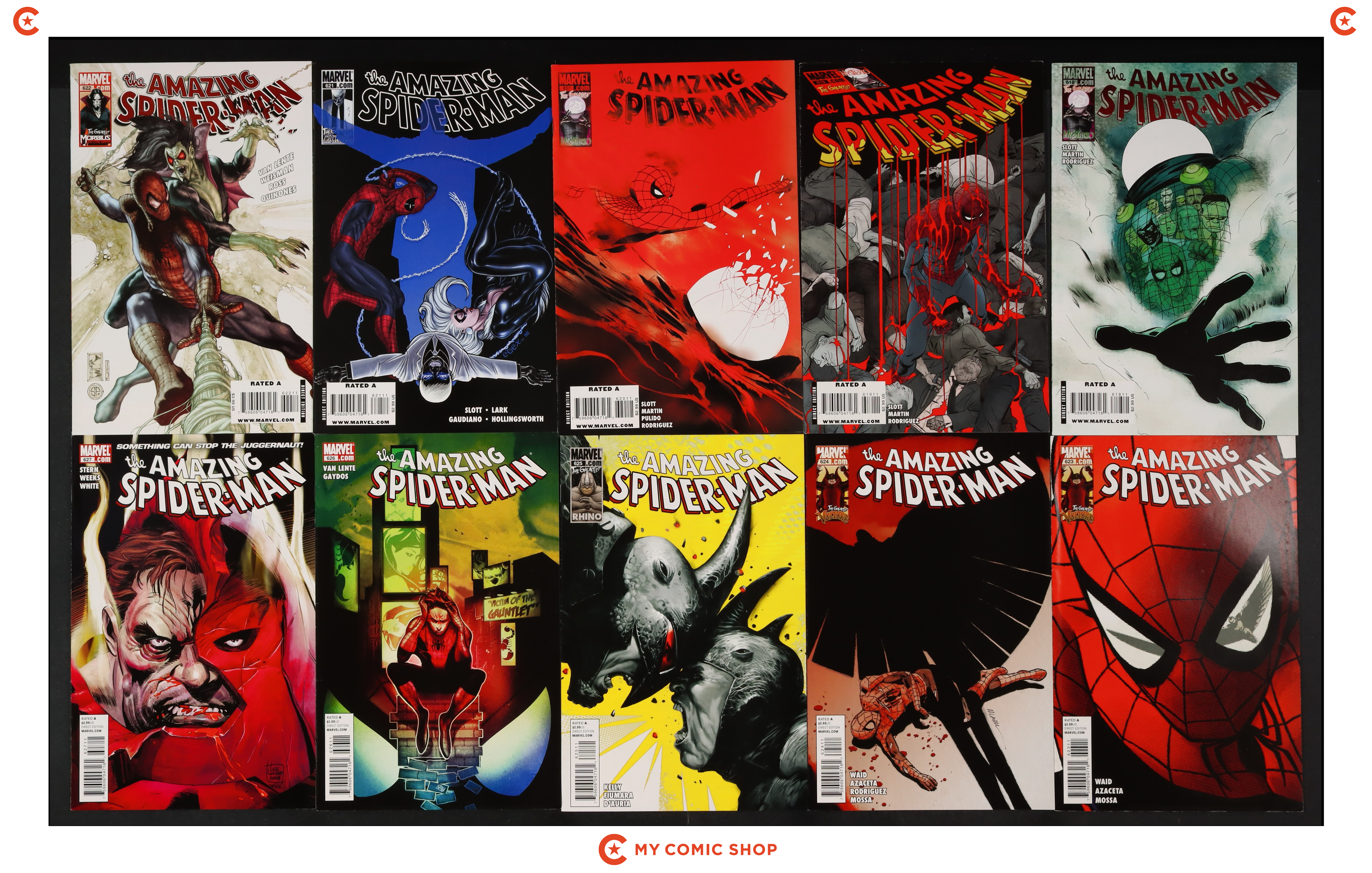 Issues 618A, 619, 620A, 621, 622, 623A, 624A, and 625-627 of Amazing Spider-Man (1998 2nd Series). Most will grade in the VF to FN range.