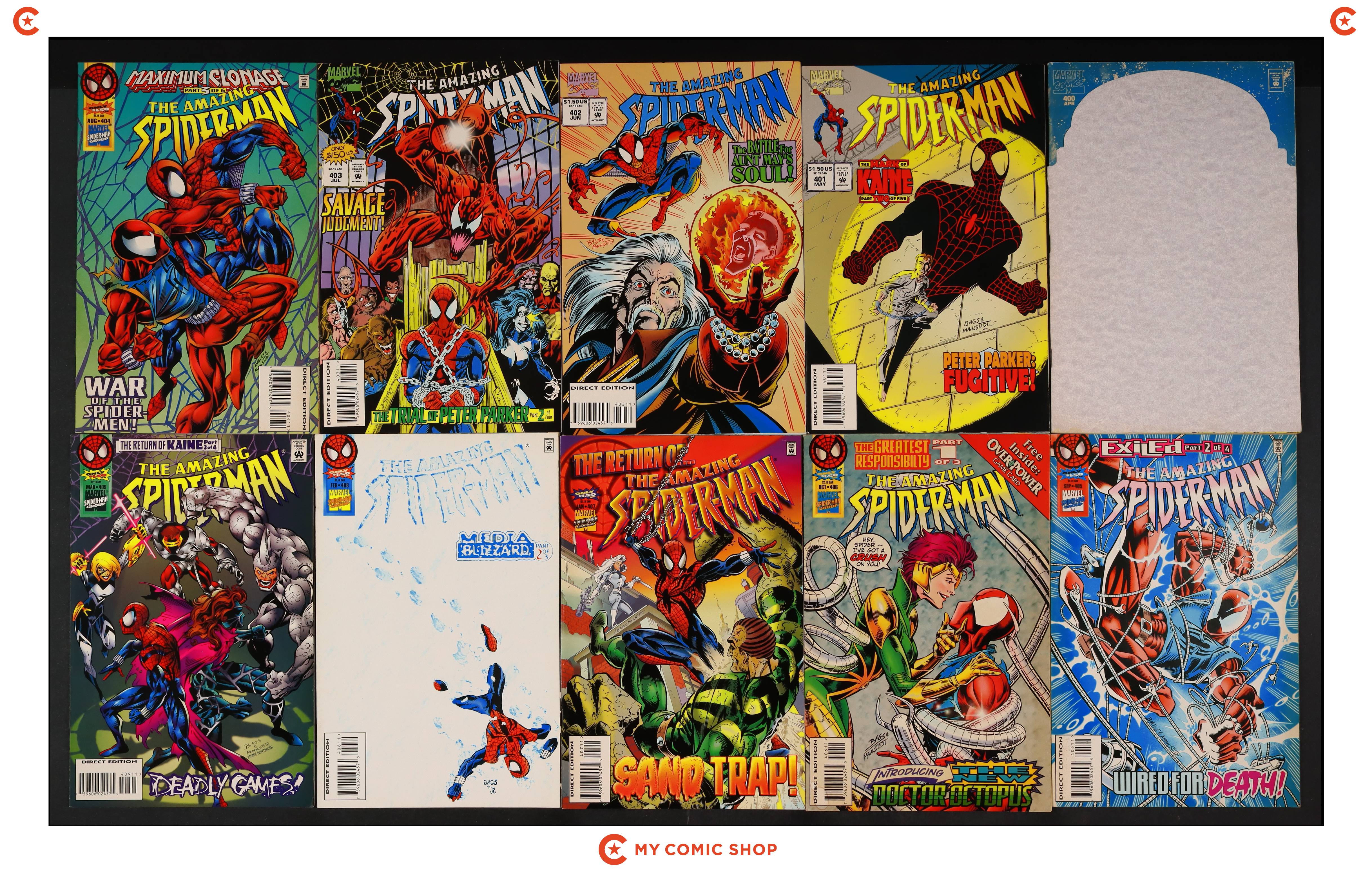 Issues 400A, 401-407, 408A, 409 of Amazing Spider-Man (1963 1st Series). Most will grade in the FN to VF+ range.