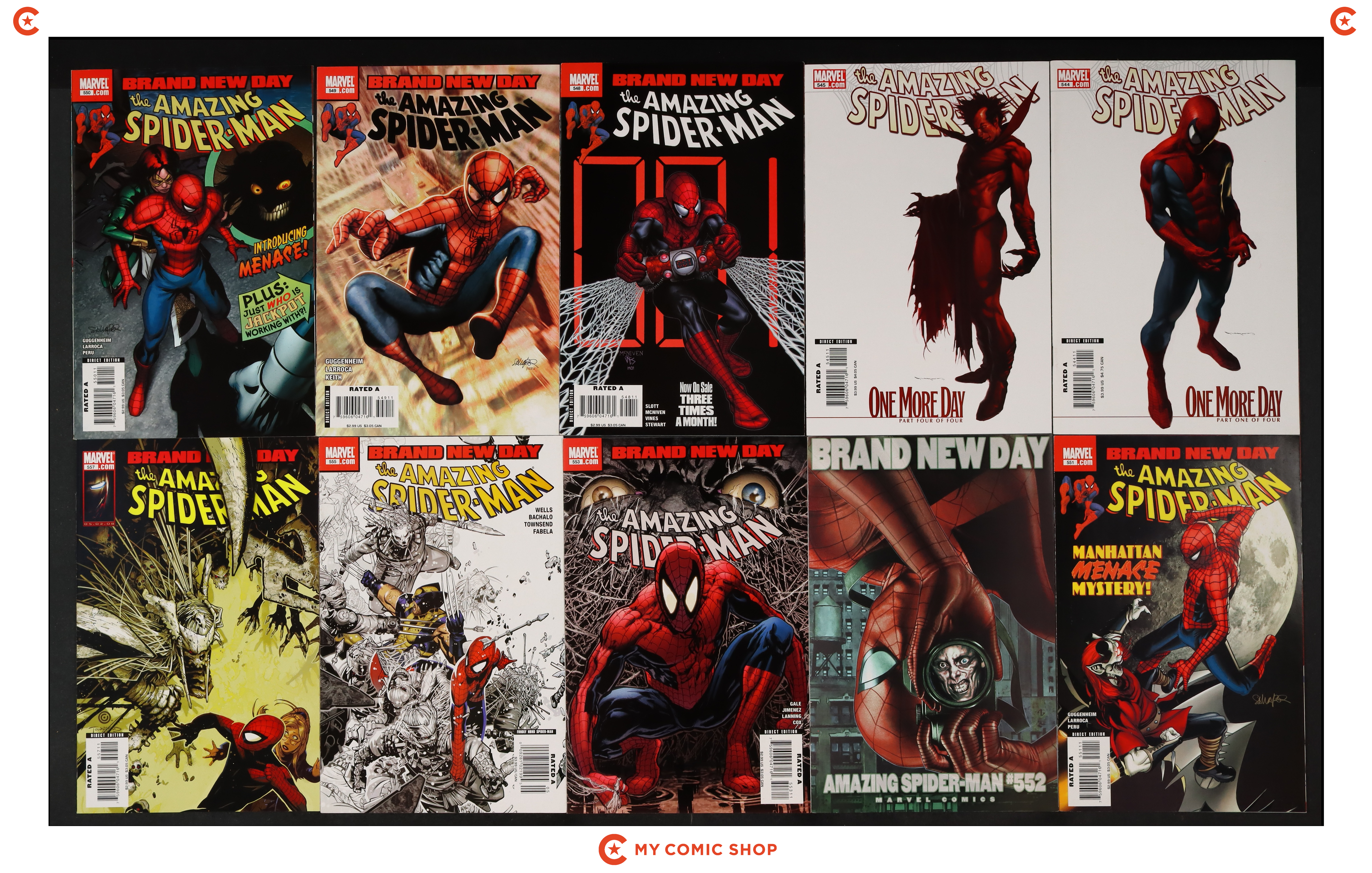 Issues 544B, 545B, 548, 549A, 550, 551, 552B, 553, 555A, and 557 of Amazing Spider-Man (1998 2nd Series). Most will grade in the FN range with a few grading VF.