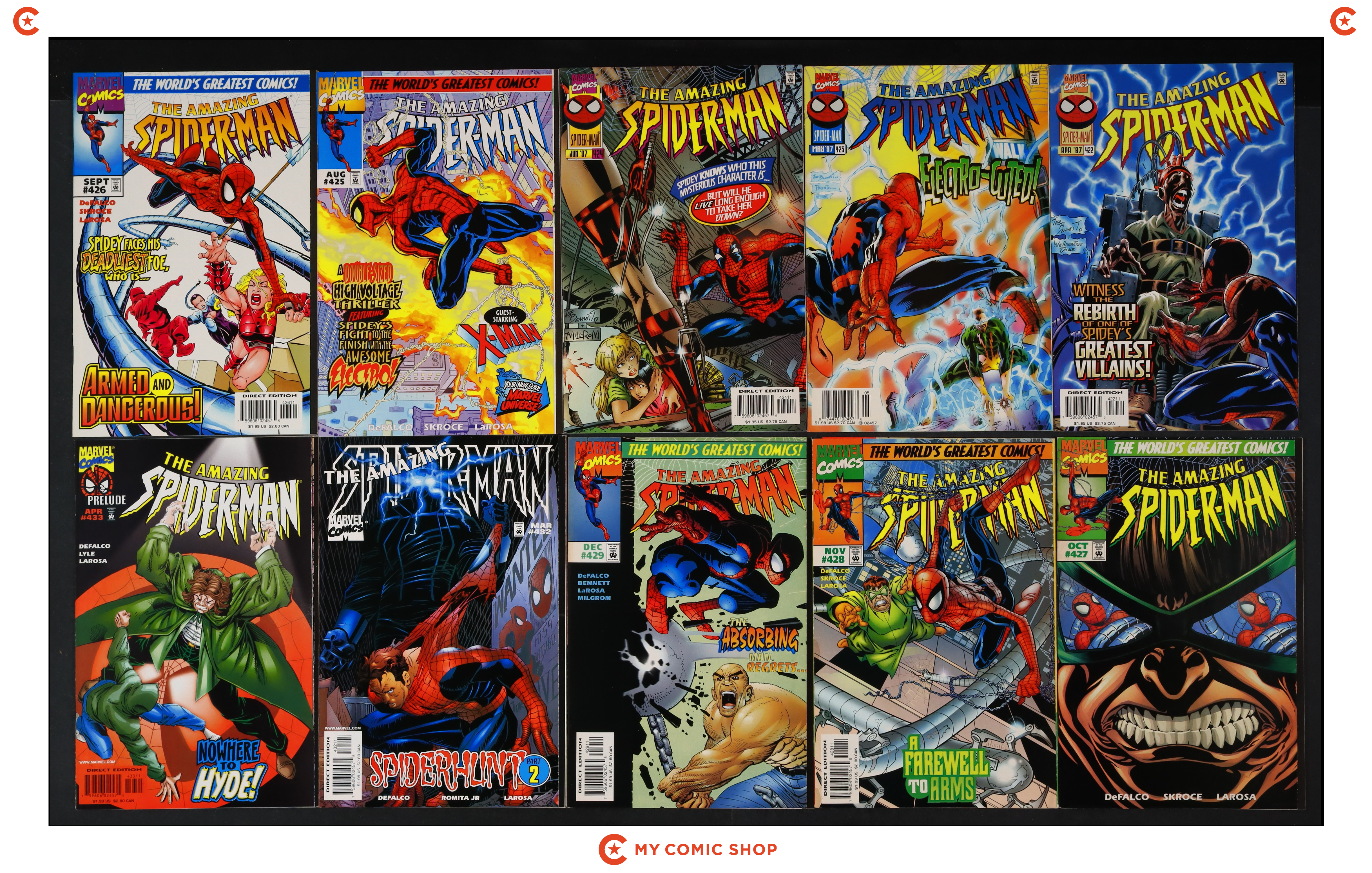 Issues 434A.D, 436-438, 441 of Amazing Spider-Man (1963 1st Series), and issues 1A.D-5 of Amazing Spider-Man (1998 2nd Series). Most will grade in the FN to VF range with #436, and #5 grading VG.