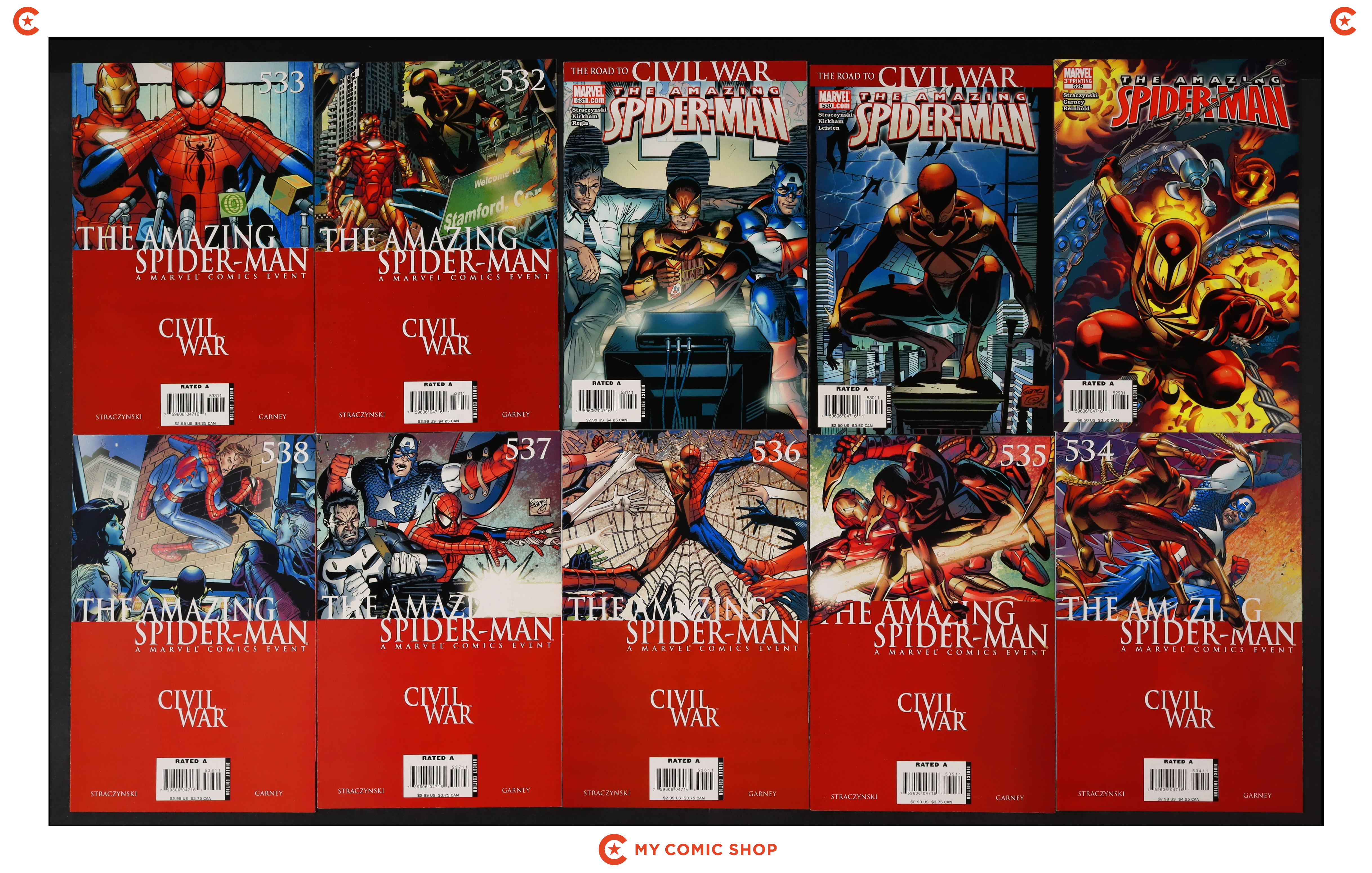 Issues 529C-532A, 533A, 534-537A, 538A of Amazing Spider-Man (1998 2nd Series). Most will grade in the FN to VF range.