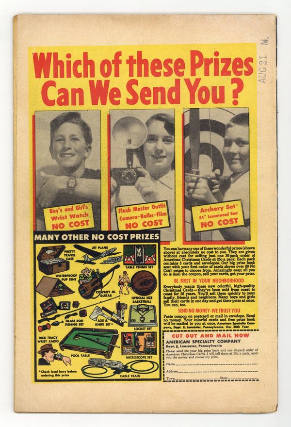 Ends Apr 13 9:56 PM CST Bid History 1 bid Current Bid $1 Your Secret Max Bid If you'd like to bid, please log in or register. Cover art by Lou Fine. Celllini's Long-Distance Destroyer starring Flame and Mike Cellini. Yarko story. Shorty Shortcake story, script and art by S. M. Iger (Jerry Williams). The Farmhouse Murder Mystery starring Patty O'Day and Von Mitz, art by Claire Moe (Vic Todd). The Isle of Sighs starring Dr. Fung, art by Bob Powell (Arthur Dean). Tommy Taylor in Alaska text story by William T. Libby. Massacre At Moose Mountain starring Tex Maxon, the Phantom Rider, art by Munson Paddock (Cecilia Munson). Visiting the Empire State starring Don Quixote. Mission To Tato starring Spark Stevens, script and art by Klaus Nordling. Sir Malcolm's Double--K-51 Spies At War. 68 pgs. $0.10. Cover price $0.10.