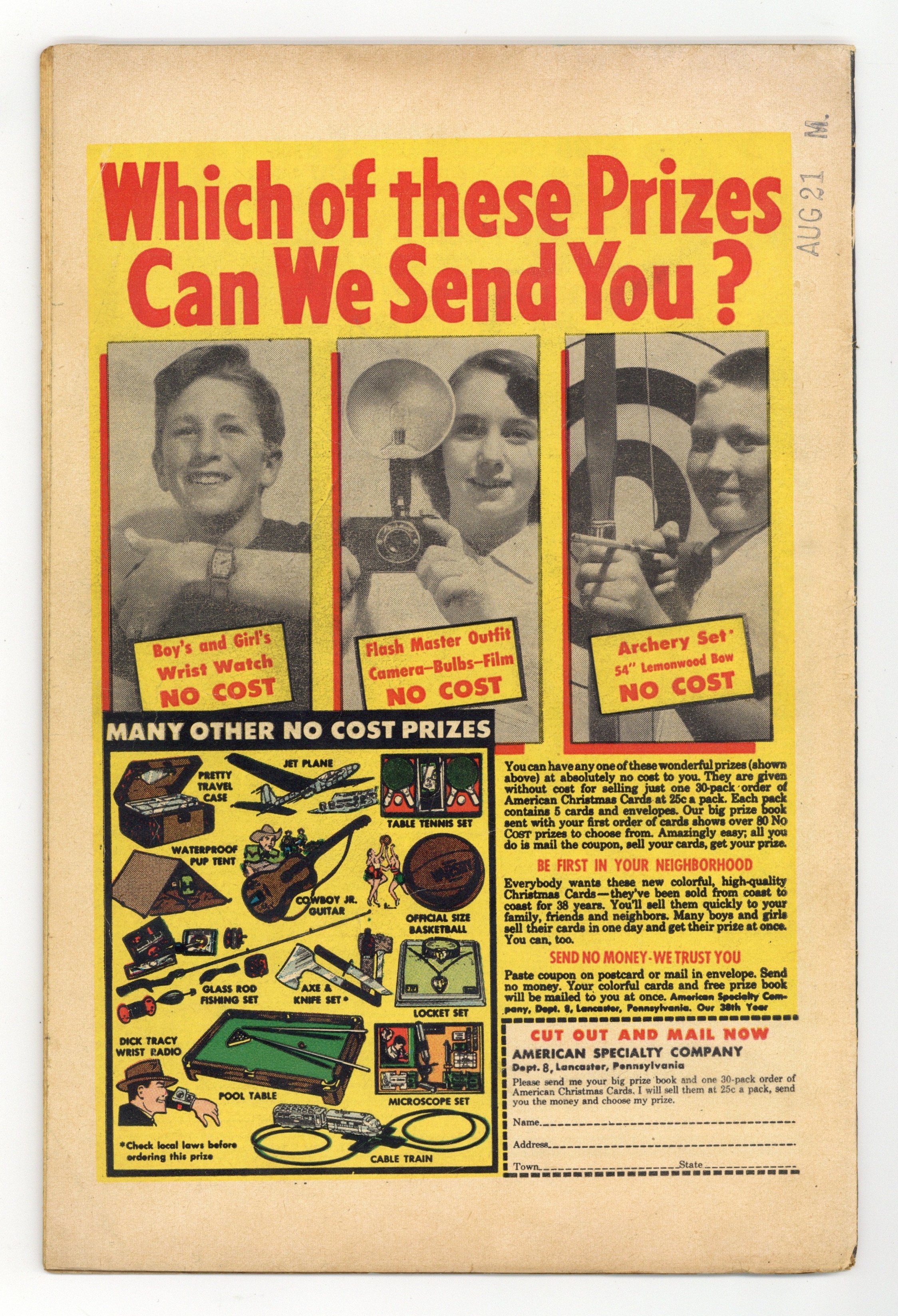Starts May 11 Cover art by Winslow Mortimer. When Gotham City Challenged Metropolis, script by Edmond Hamilton, pencils by Curt Swan, inks by Stan Kaye; Batman and Superman have a contest to do the most civic good deeds during a 24 hour period. An electronics convention will be held in the city of the winner. Honey in Hollywood humor page by Henry Boltinoff. Sagebrush Sam humor two-pager by Henry Boltinoff. Supergram the Superman Puzzle Game. The Mechanical Archer starring Green Arrow, art by George Papp. Detectives Who Chase Insects text article, script by Jack Miller, art by Raymond Perry. House ad for Leave it to Binky #47 and Superman's Pal, Jimmy Olsen #5. The Schooner on Wheels starring Tomahawk, art by Fred Ray. 36 Pages, Full Color. Cover price $0.10.