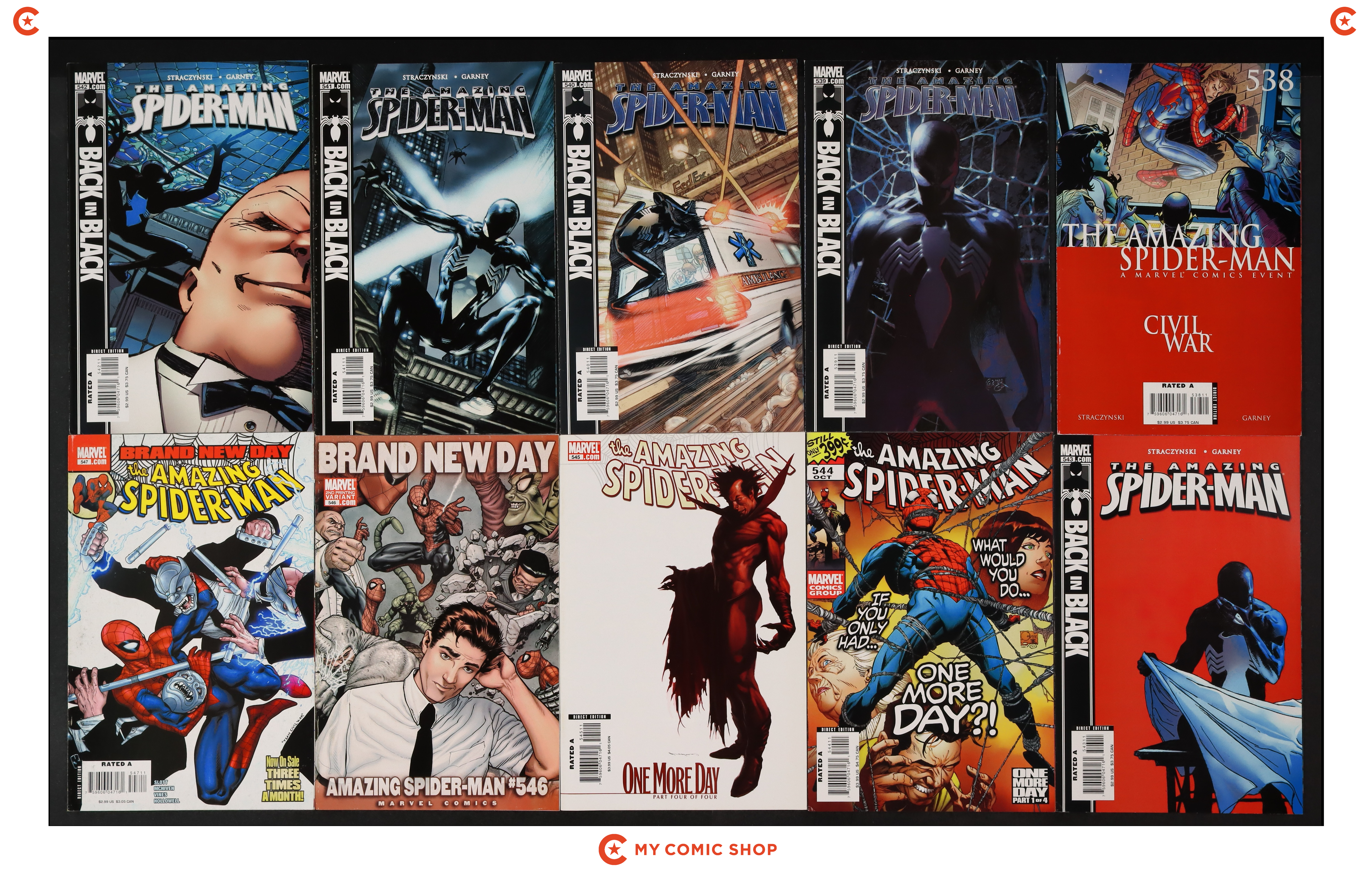 Issues 538A, 539A, 540, 541, 542, 543, 544A, 545B, 546D, 547 of Amazing Spider-Man (1998 2nd Series). Most will grade in the