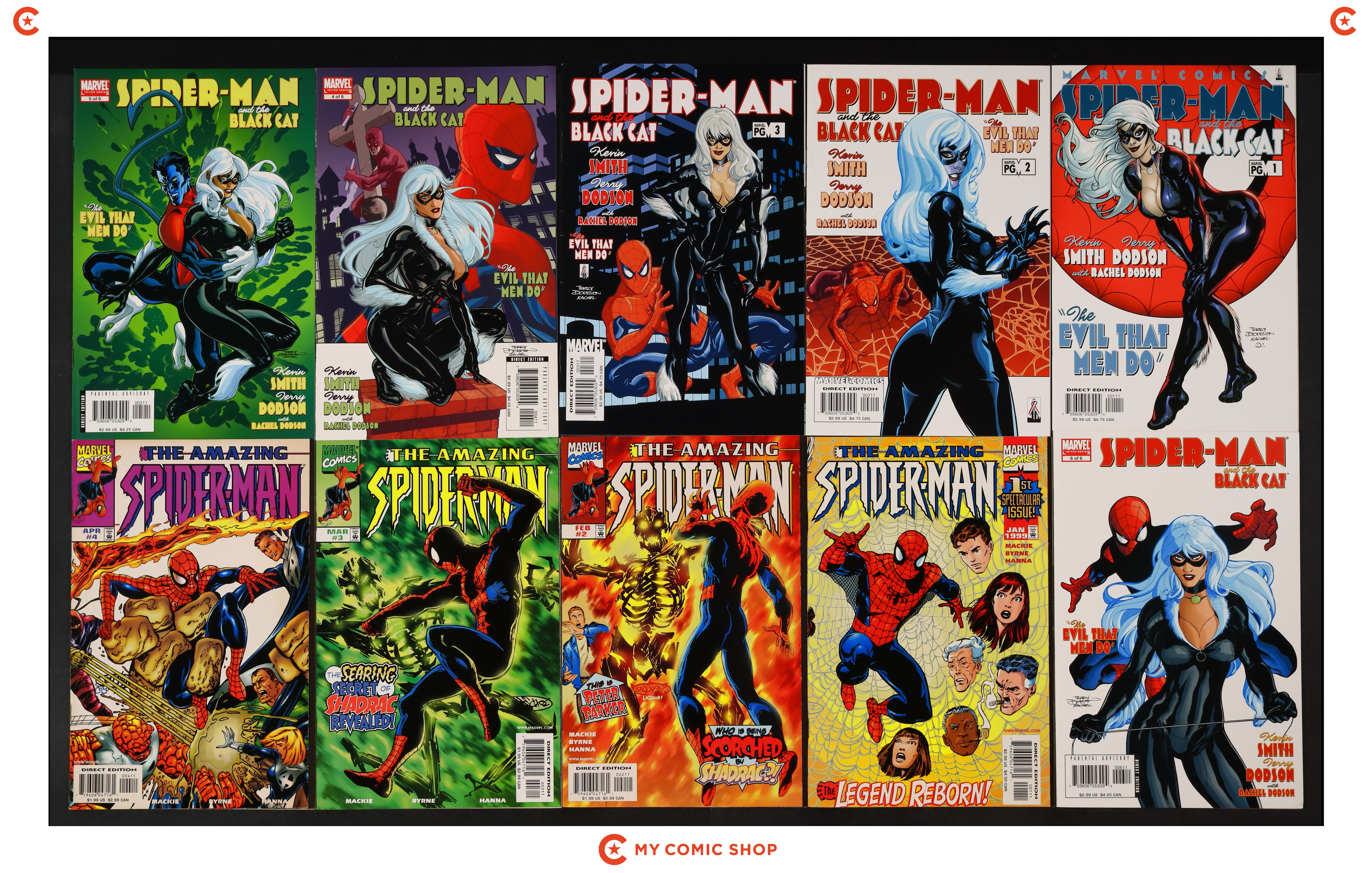 Issues 1-6 of Spider-Man and the Black Cat The Evil That Men Do (2002), and issues 1A.D-4 of Amazing Spider-Man (1998 2nd Series). Most will grade in the FN to VF range.