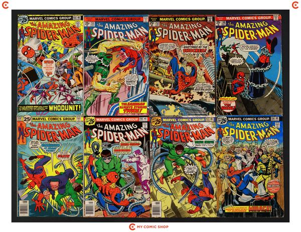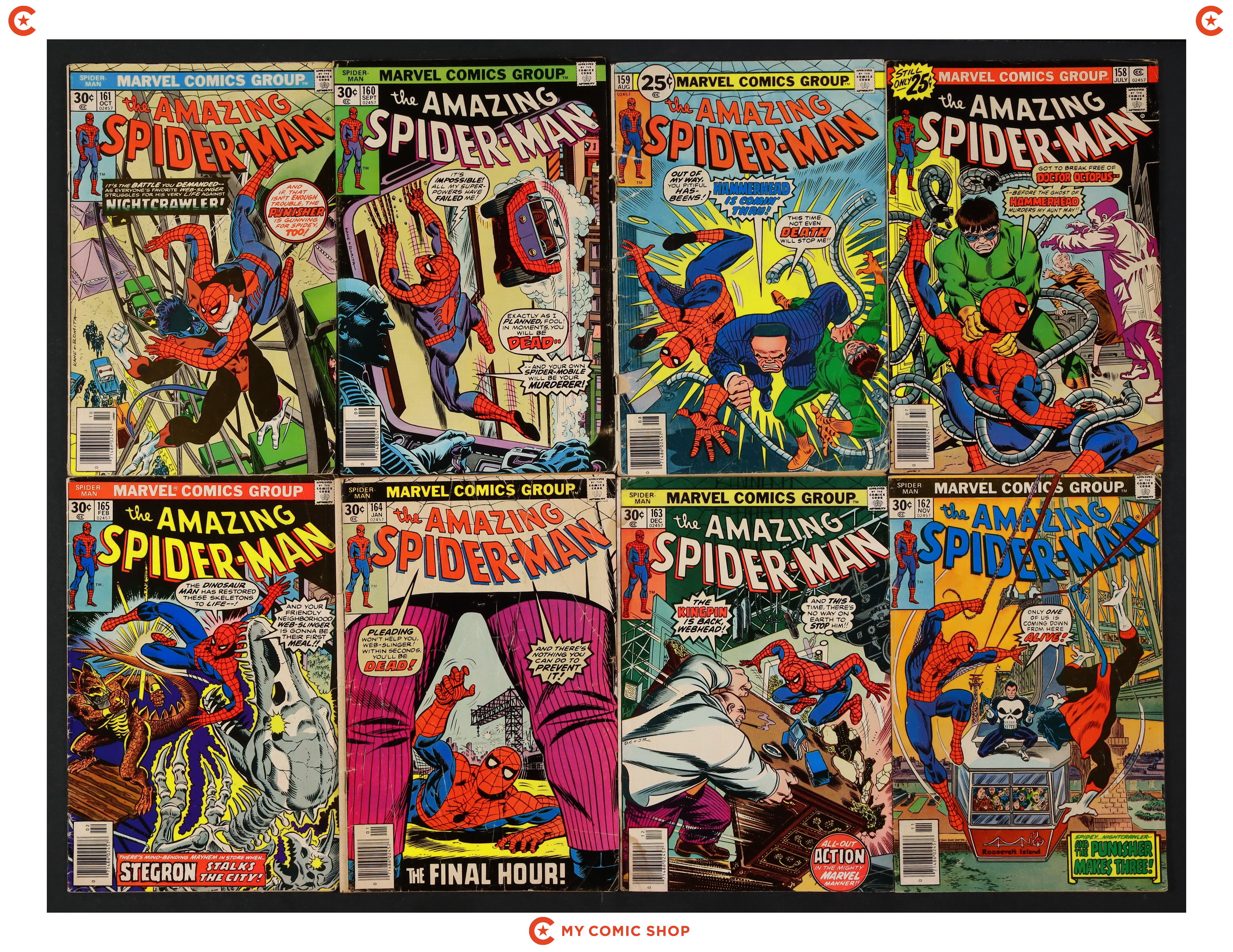 Issues 158, 160-165 of Amazing Spider-Man (1963 1st Series); plus Mark Jewelers variant 159MJ. Most will grade in the FR/GD to GD/VG range.