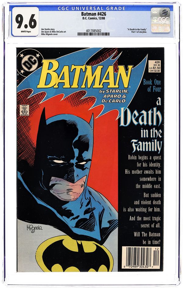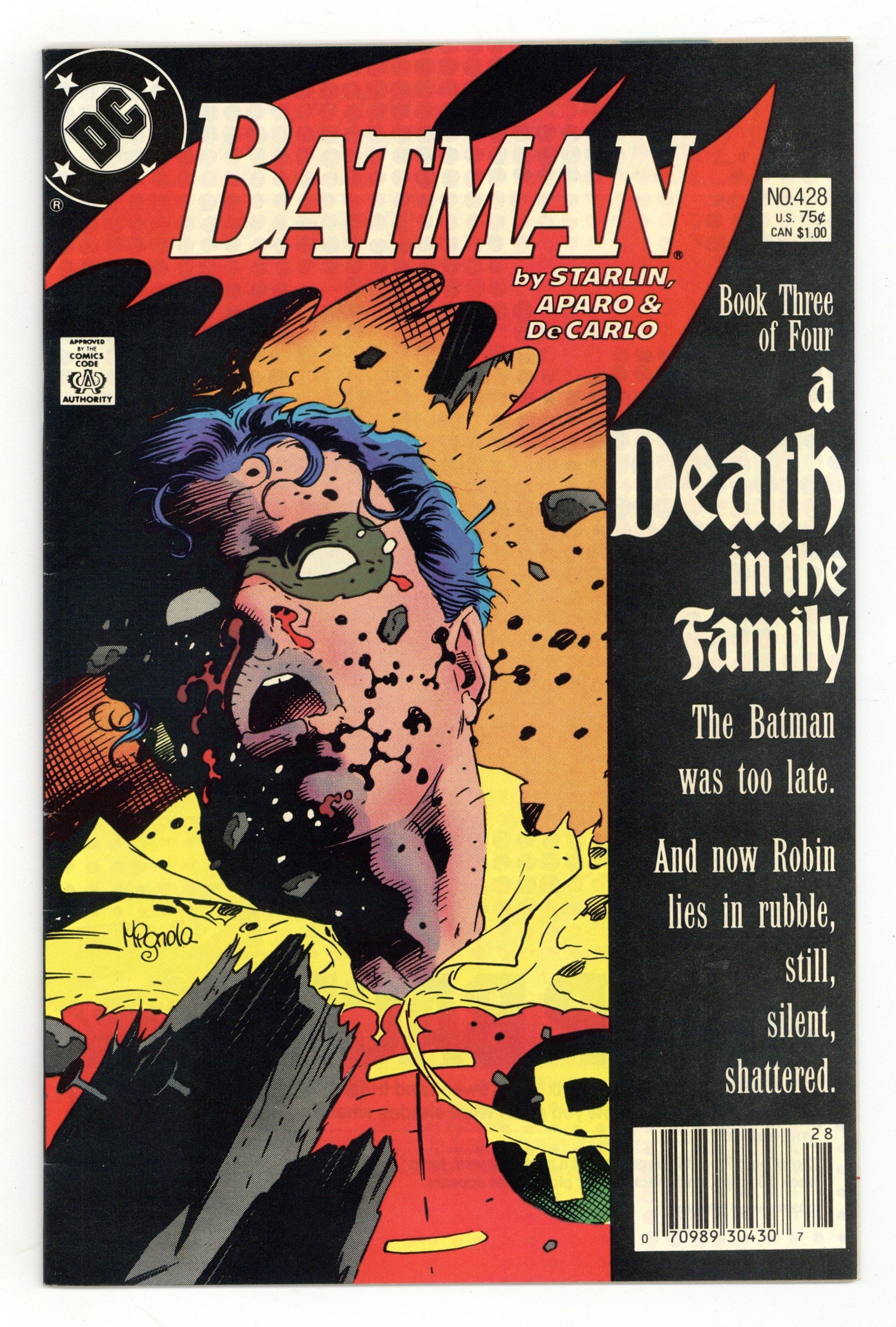 Ends Feb 23 7:30 PM CST Bid History 4 bids Current Bid $15 Your Secret Max Bid If you'd like to bid, please log in or register. First printing. Newsstand Edition. Cover art by Mike Mignola. "A Death in the Family" part 1 of 4, script by Jim Starlin, pencils by Jim Aparo, inks by Mike DeCarlo; Jason discovers that his "real" mother was really his step-mother, and his birth mother is still alive; Joker escapes from Arkham and Batman chases him to the Middle East where he runs across Jason looking for one of the women he thinks is his mom. Infamous story where readers called an 800 number, and 'voted' to have Robin killed! Story continues in Batman #427. NOTE: Most issues from 397-432 were reprinted in 1989 and sold in multipacks. These 2nd and 3rd prints have back cover ads dated 1989. 52 Pages, Full Color. Cover price $1.50.