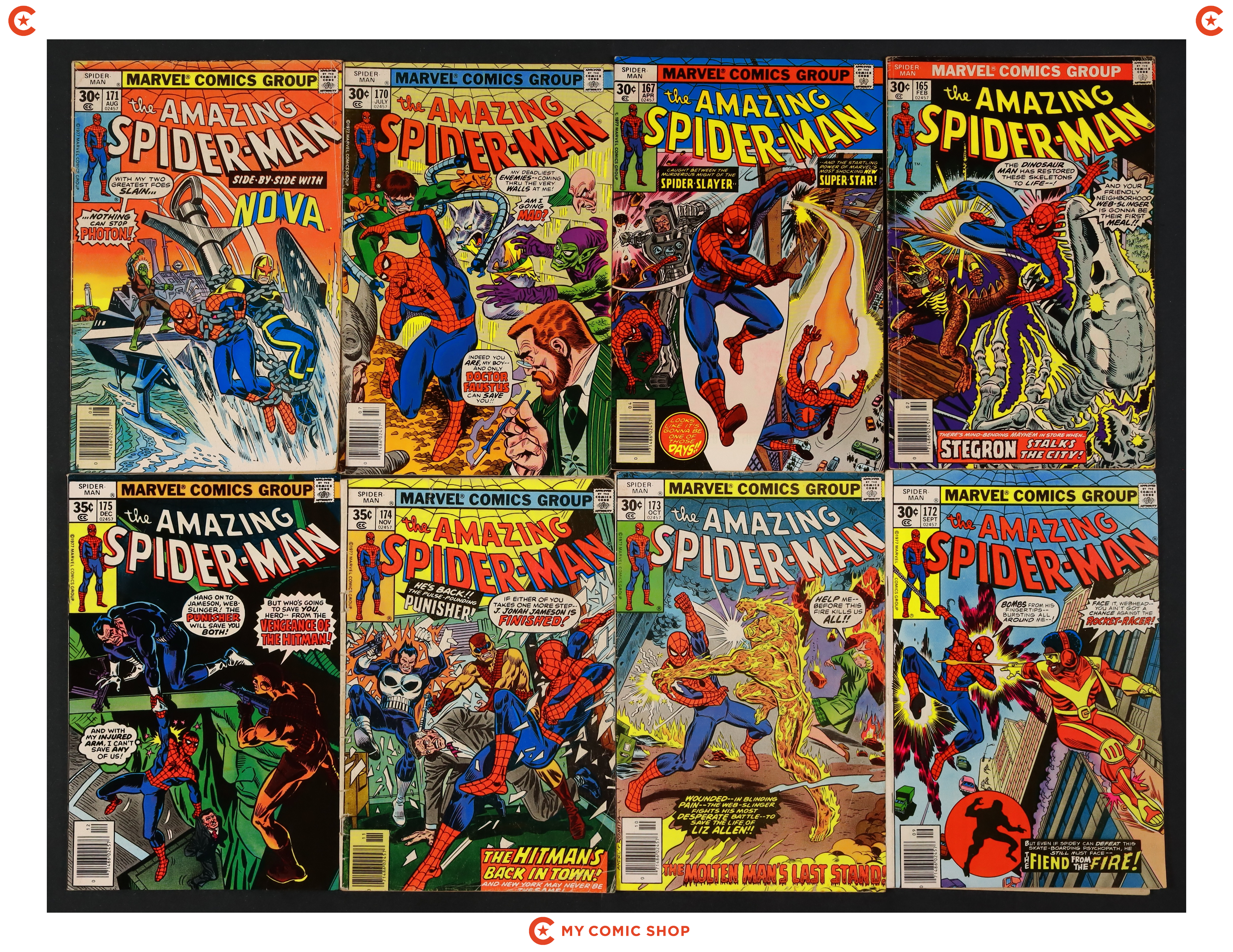 Issues 165, 167, 168, 170-172 of Amazing Spider-Man (1963 1st Series); plus Whitman variant 173 and 174. Most will grade in the FR/GD to VG+ range.