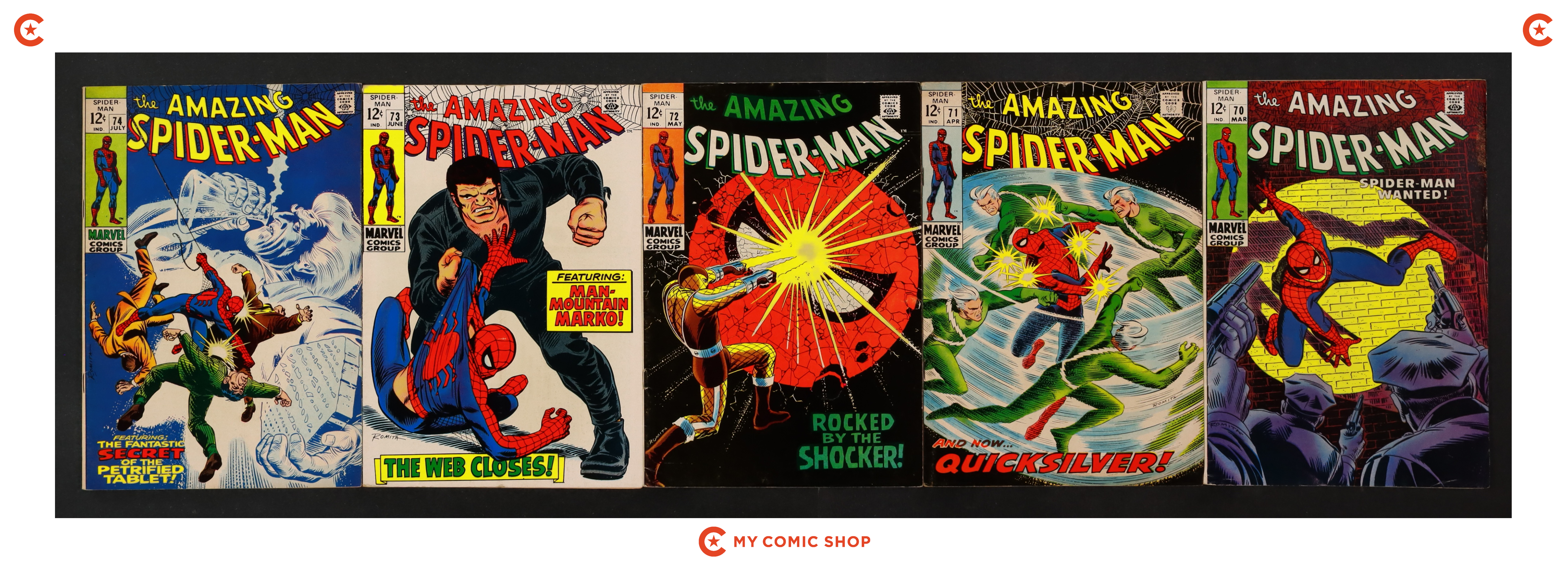 Issues 70-74 of Amazing Spider-Man (1963 1st Series). Most will grade in the GD+ to VG/FN range.