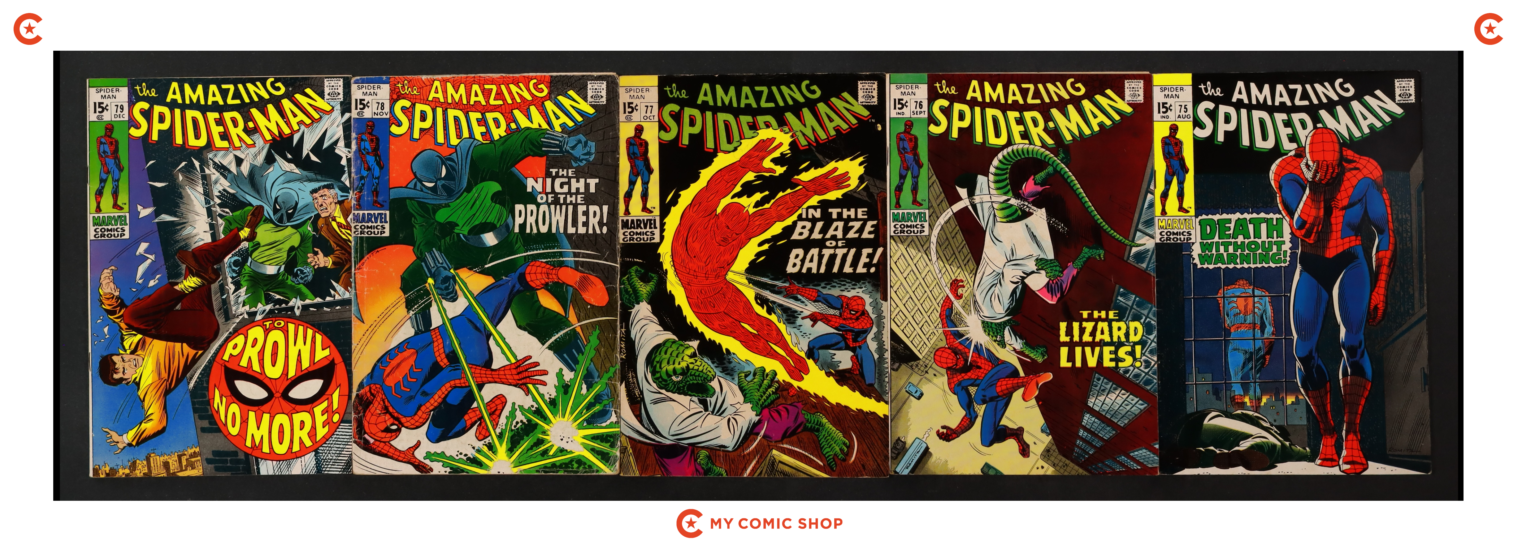 Issues 75-79 of Amazing Spider-Man (1963 1st Series). Most will grade in the VG to VG/FN range, with #78 grading at FR/GD.
