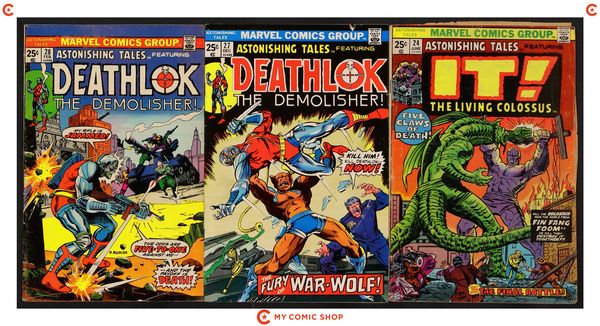 Issues 2, 4, 9, 10, 14, 16, 21, 23, 24 of Astonishing Tales (1970). Most will grade in the VG range with #14 and #16 grading FN and #4 and #10 grading GD.