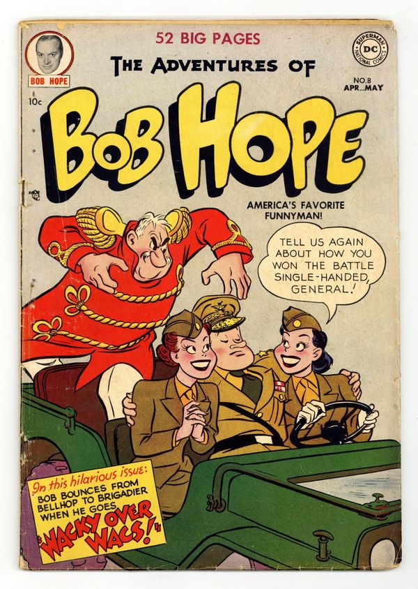 Starts Mar 9 Cover by Owen Fitzgerald. Written by Cal Howard, Henry Boltinoff and unknown. Art by Owen Fitzgerald, Henry Boltinoff and Bob Oksner. Bob Hope, America's favorite funnyman, bounces from bellhop to brigadier when he goes..."Wacky Over WACs!" by Cal Howard and Owen Fitzgerald. Plus: Two Honey in Hollywood strips by Henry Boltinoff; Peg 1-pager by Boltinoff; Miss Beverly Hills of Hollywood back-up story, with art by Bob Oksner; Jerry the Jitterbug half-pager by Boltinoff; and A Bit of Disc and Data article. 48 pages, full color. Cover price $0.10.