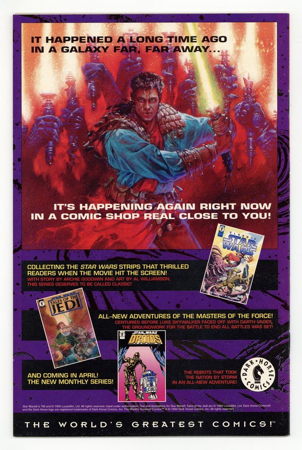 Starts Apr 20 May or may not be polybagged with trading card. Written by Archie Goodwin. Art by Al Williamson and Carlos Garzon. Cover by Adam Hughes. Dark Horse presents Classic Star Wars: Return of the Jedi, the next thrilling chapter in the greatest space fantasy ever! The Emperor and Darth Vader make the final preparations to destroy the Rebel Alliance once and for all. Meanwhile, Luke Skywalker, now a Jedi Knight, must rescue Han Solo, frozen in carbonite, from the palace of Jabba the Hutt. FC Cover price $3.50.