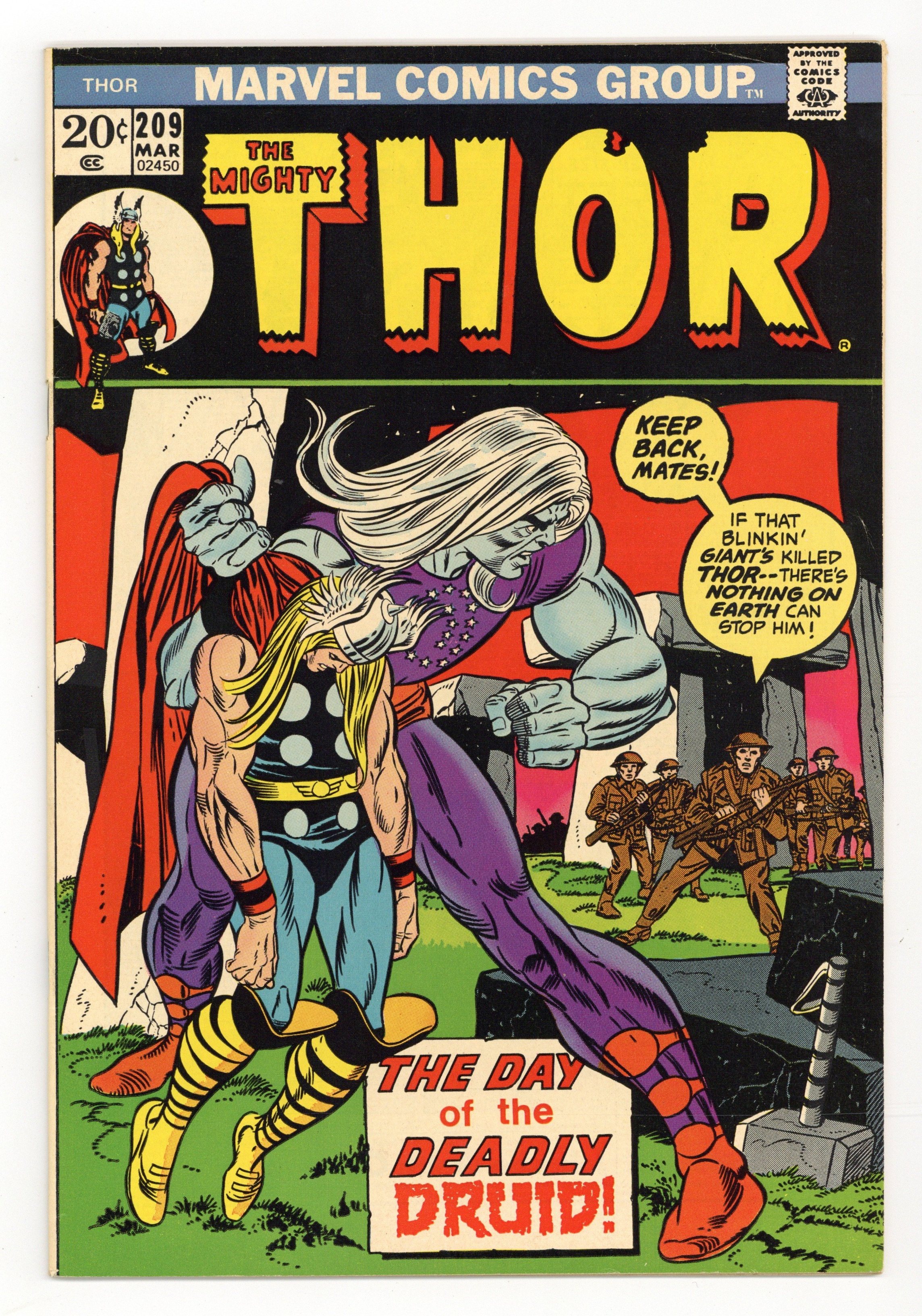 Starts Jan 26 Cover pencils by Gil Kane, inks by Joe Sinnott. First appearance of the Demon Druid in "Warriors in the Night!", script by Gerry Conway, pencils by John Buscema, inks by Vince Colletta; Thor is in England searching for Sif, when the Demon Druid awakens, and begins tearing a path through the town; Thor tries to stop him, but the Druid is too powerful; One of the police officers discovers that the Druid is not attacking anyone, he is only acting in self-defense; When the Druid gets to Stonehenge, he is transported home. Cameos by Sif, Hildegarde, Karnilla, and Loki. The letters page contains a statement of ownership: average print run 374,159; average paid circulation 207,179. 36 pgs., full color. $0.20. Cover price $0.20.