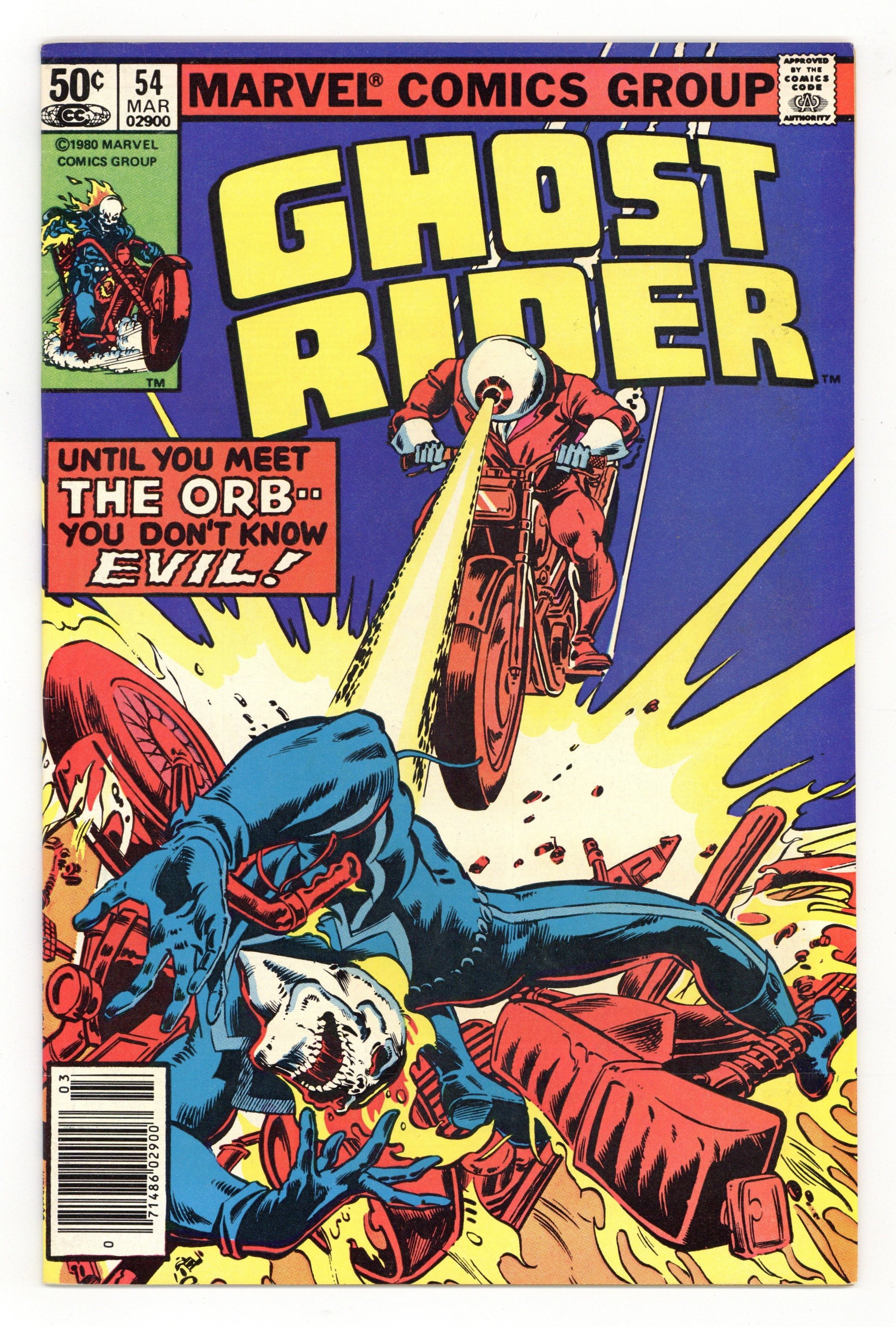Starts Feb 16 Newsstand Edition. "Orb of Evil...Eye of Doom!" Story by Michael Fleisher. Art by Don Perlin. Cover by Bob Budianski and Joe Rubenstein. One of the Ghost Rider's most tenacious foes, the uncanny Orb, returns for more mayhem! 32 pages, FC. NOTE: Human Torch stars in Hostess ad "Blown Away!" Cover price $0.50.