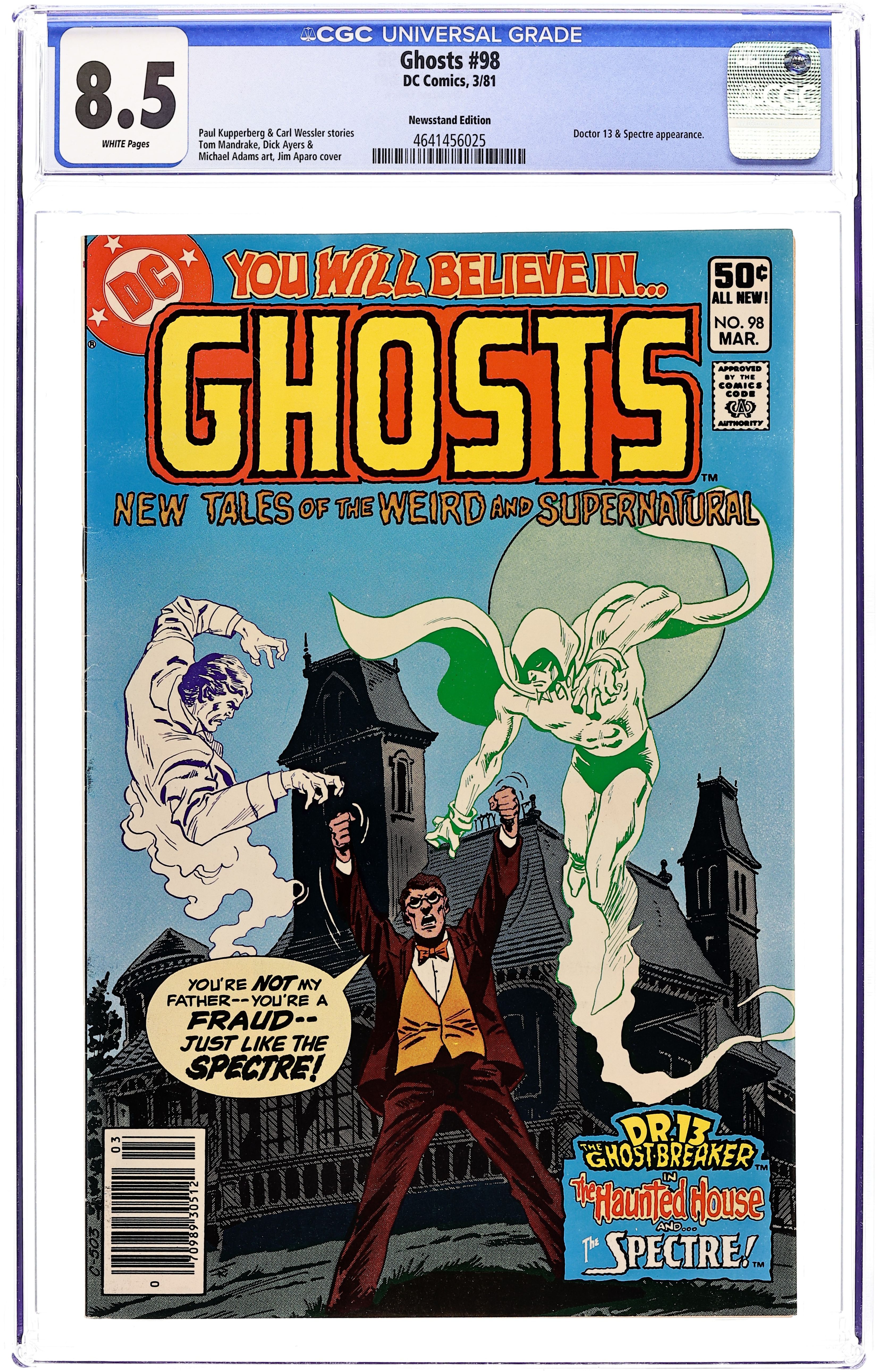 Starts Feb 2 Newsstand Edition. Cover by Jim Aparo. Featuring: 1 page intro story "The Files of Dr. Geist" drawn by Greg LaRocque & Rodin Rodriguez; 6 page story "The Death of a Ghost!" written by Carl Wessler and drawn by Dick Ayers & Joe Giella; 1 page story "Great Ghost!" by Dave Manak; 6 page story "The Asylum of Specters" written by Carl Wessler and drawn by Redondo Studio; 3 page story "Spirit, Don't Save Me!" written by George Kashdan and drawn by Tom Mandrake; 8 page Dr. 13 the Ghost-Breaker story "The Haunted House and The Spectre!" written by Paul Kupperberg and drawn by Michael Adams & Tex Blaisdell. Cover price $0.50.