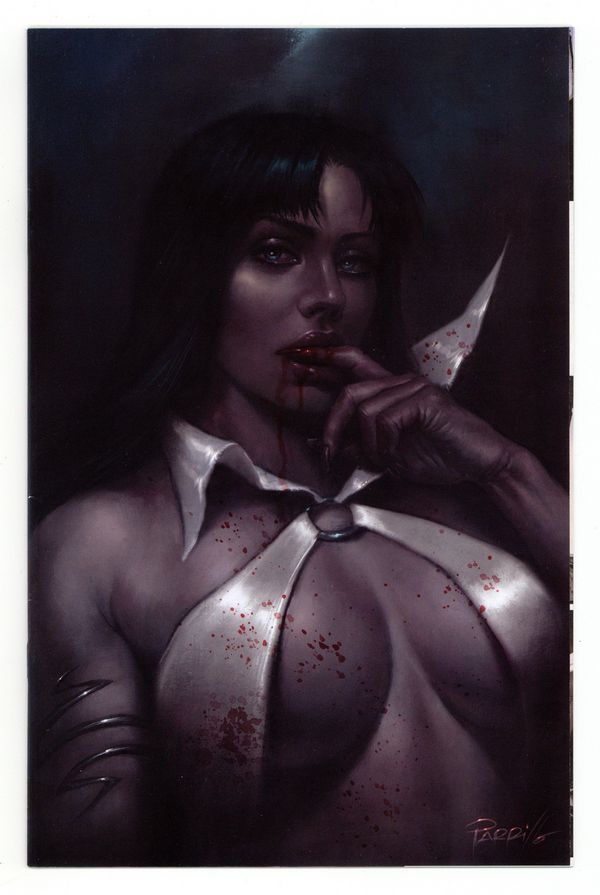 Starts May 4 616 Comics Exclusive "Dark" Virgin cover by Celina - limited to 500 copies. Written by Christopher Priest. Art by Donny Hadiwidjaja. Cover by Jamie Biggs. The honeymoon begins! The adventure of several lifetimes begins as Vampirella and new husband Matt journey to Castle Dracula in Transylvania in an attempt to cheat fate by preventing both a high-tech virus and an ancient curse from using Matt's body to resurrect the deadliest threat the world has ever known. Meanwhile secrets and mystery grow around Vampi's spouse, who may not be nearly as innocent as he appears to be. Join us for this new series debut by twice-bitten writer Christopher Priest and bloodthirsty artist Donny Hadiwidjaja! 32 pages, full color. Rated T+