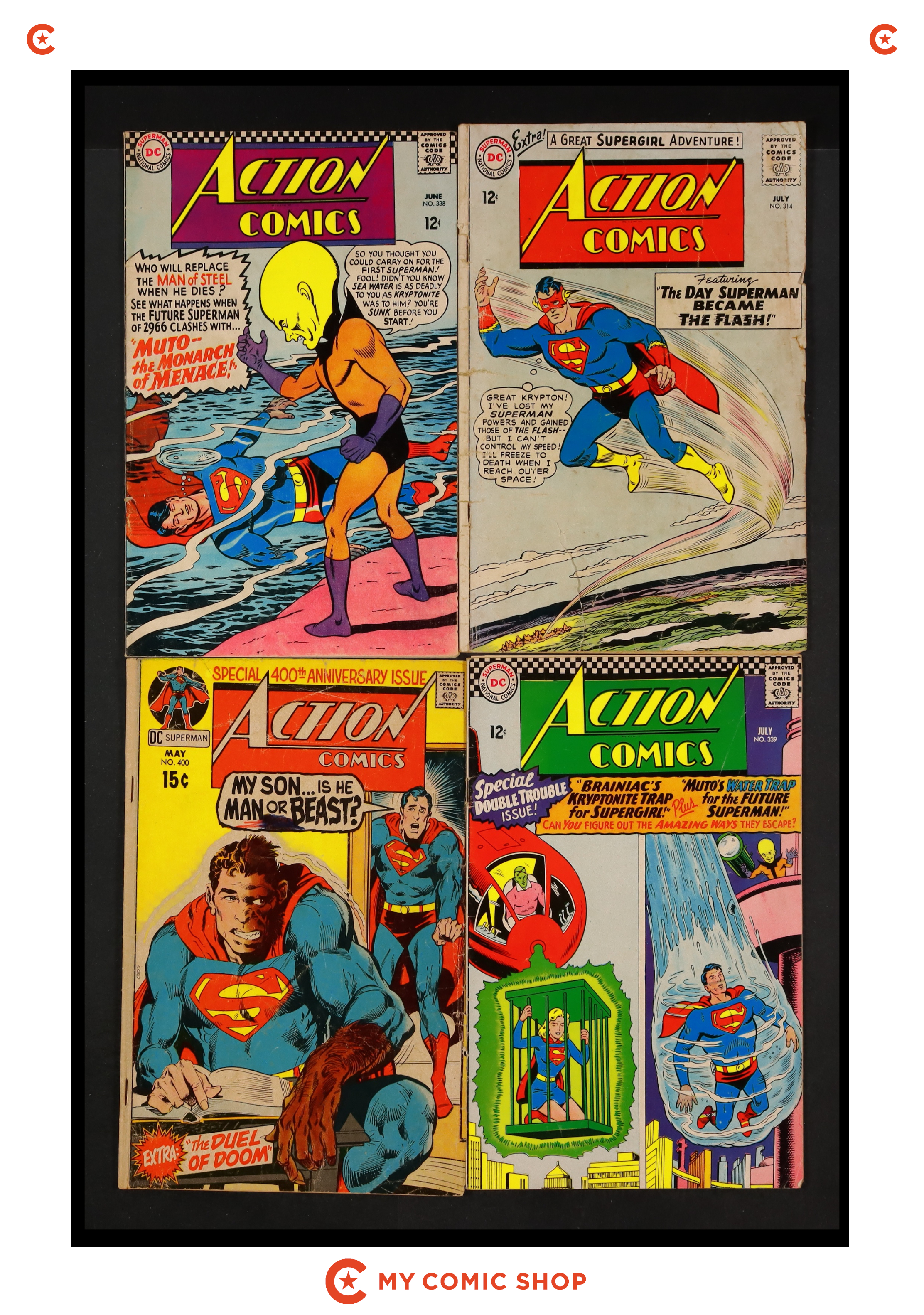 Issues 292, 306, 360, and 376 of Action Comics (1938 DC). Most will grade in the FN range with #306 grading GD and #376 grading PR (page missing, does not affect story or art).