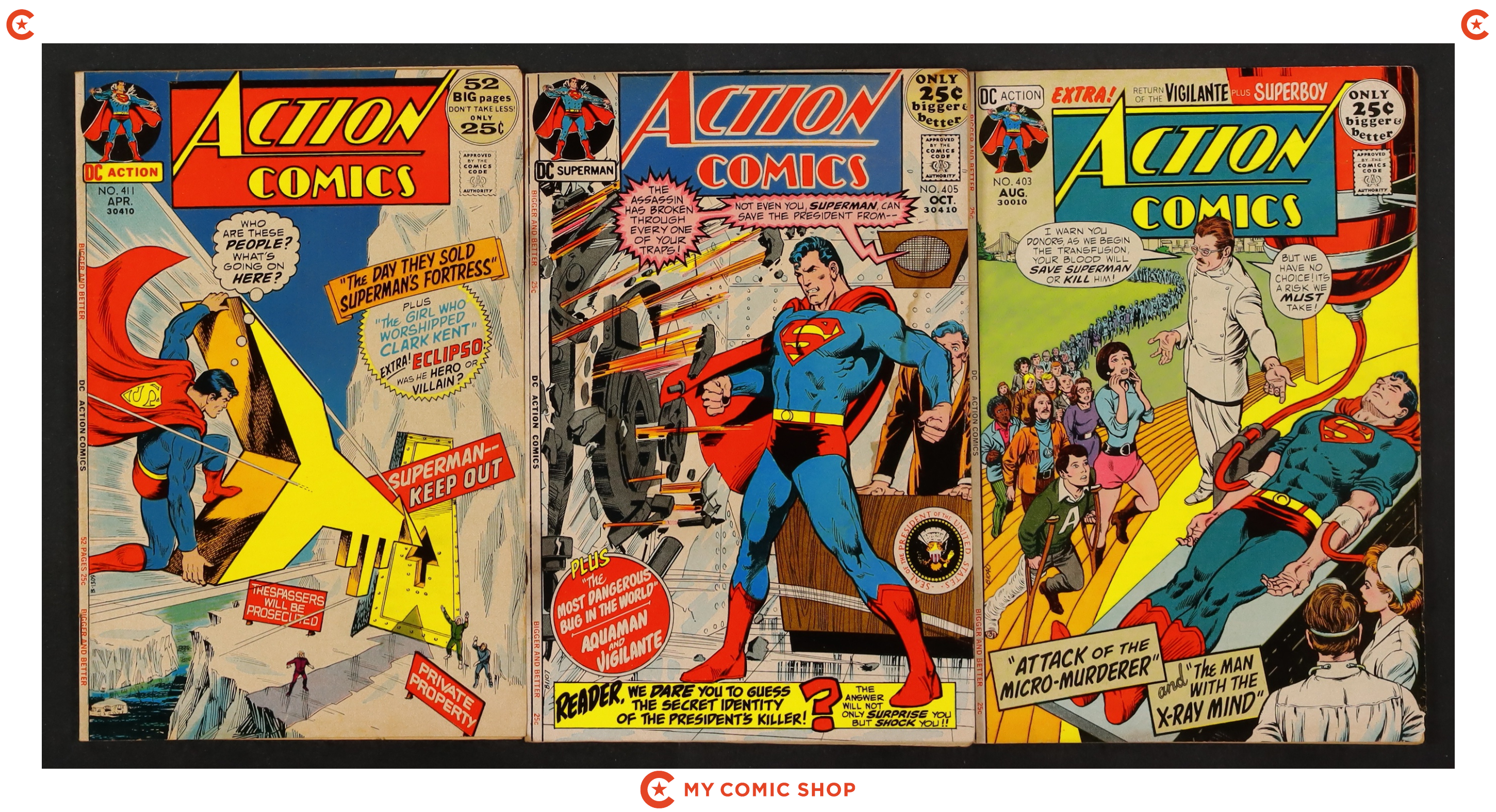 Issues 314, 338, 339, 400, 403, 405, and 411 of Action Comics (1938 DC). Most will grade in the VG to GD range.