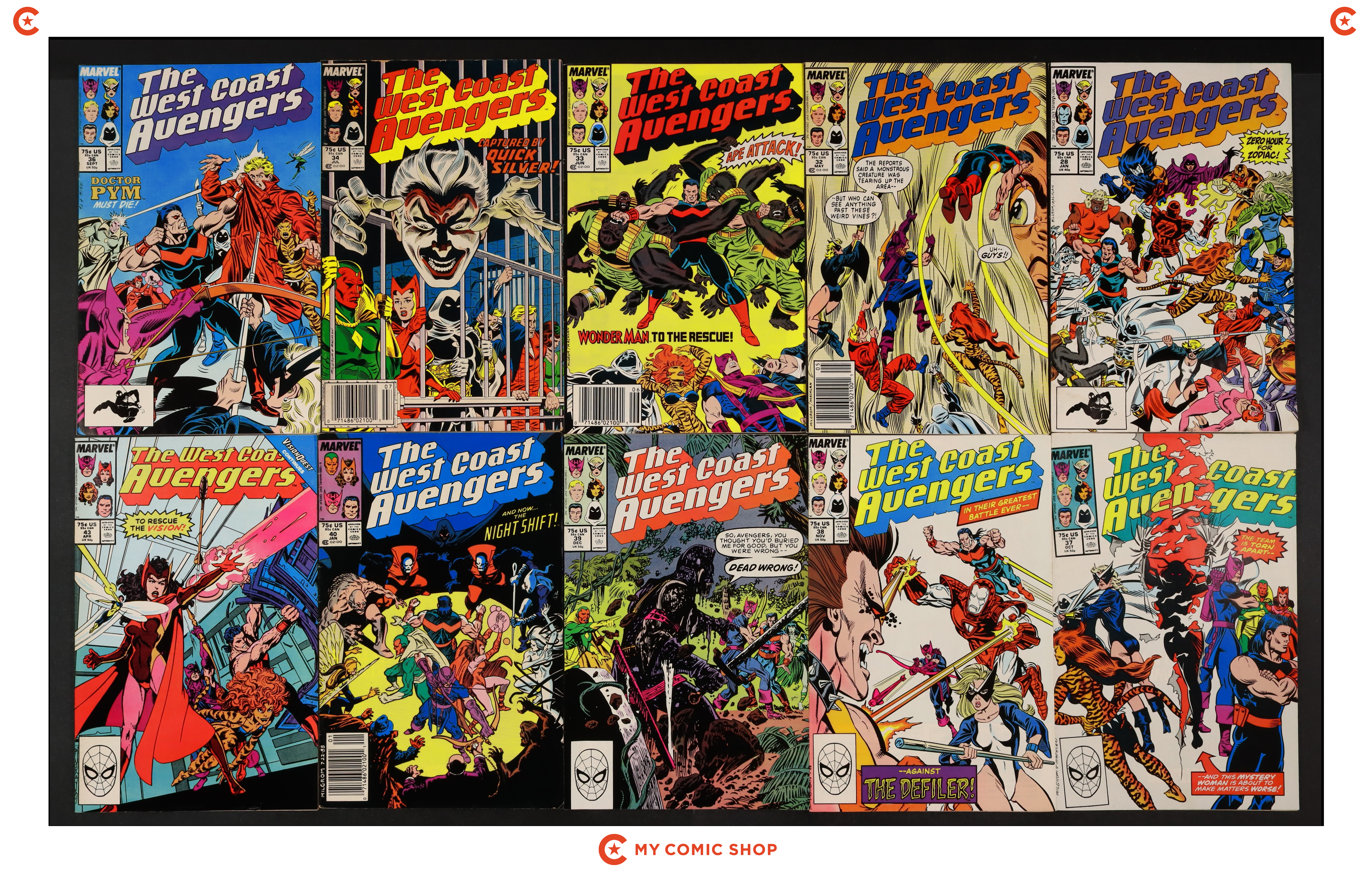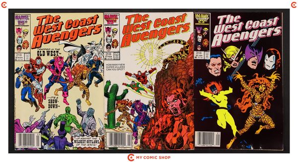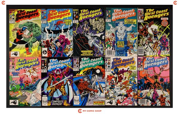 Issues 1D, 2, 7, 9, 12, 13D, 15, 17, 19, 26, 33, 36, 39, 44D, 49 of Avengers West Coast (1985). Most will grade in the VG/FN to VF range.
