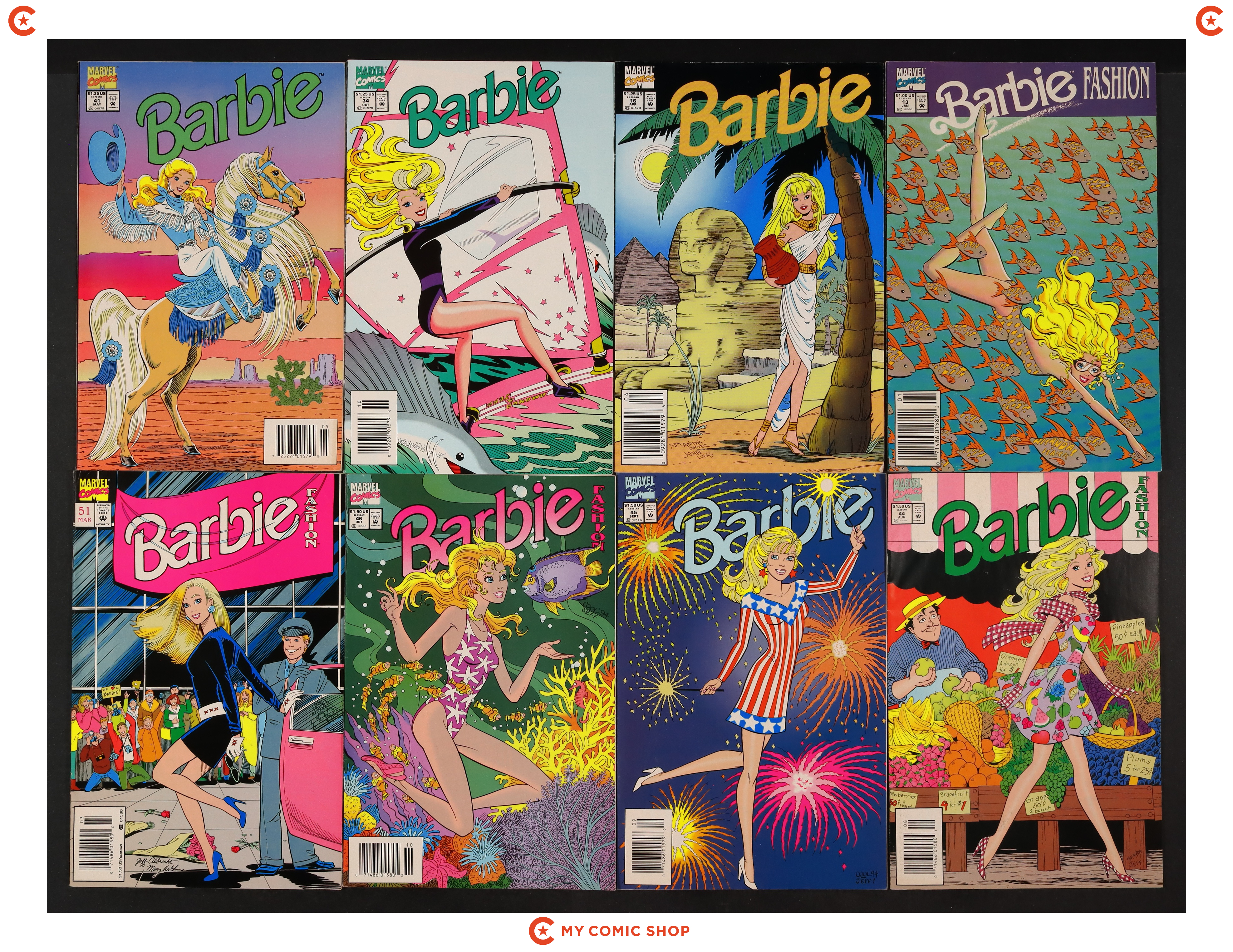 Issues 13, 16, 34, 41, 44, 45, 46, 51 of Barbie Fashion (1991 Marvel). Most will grade in the VG to FN range.
