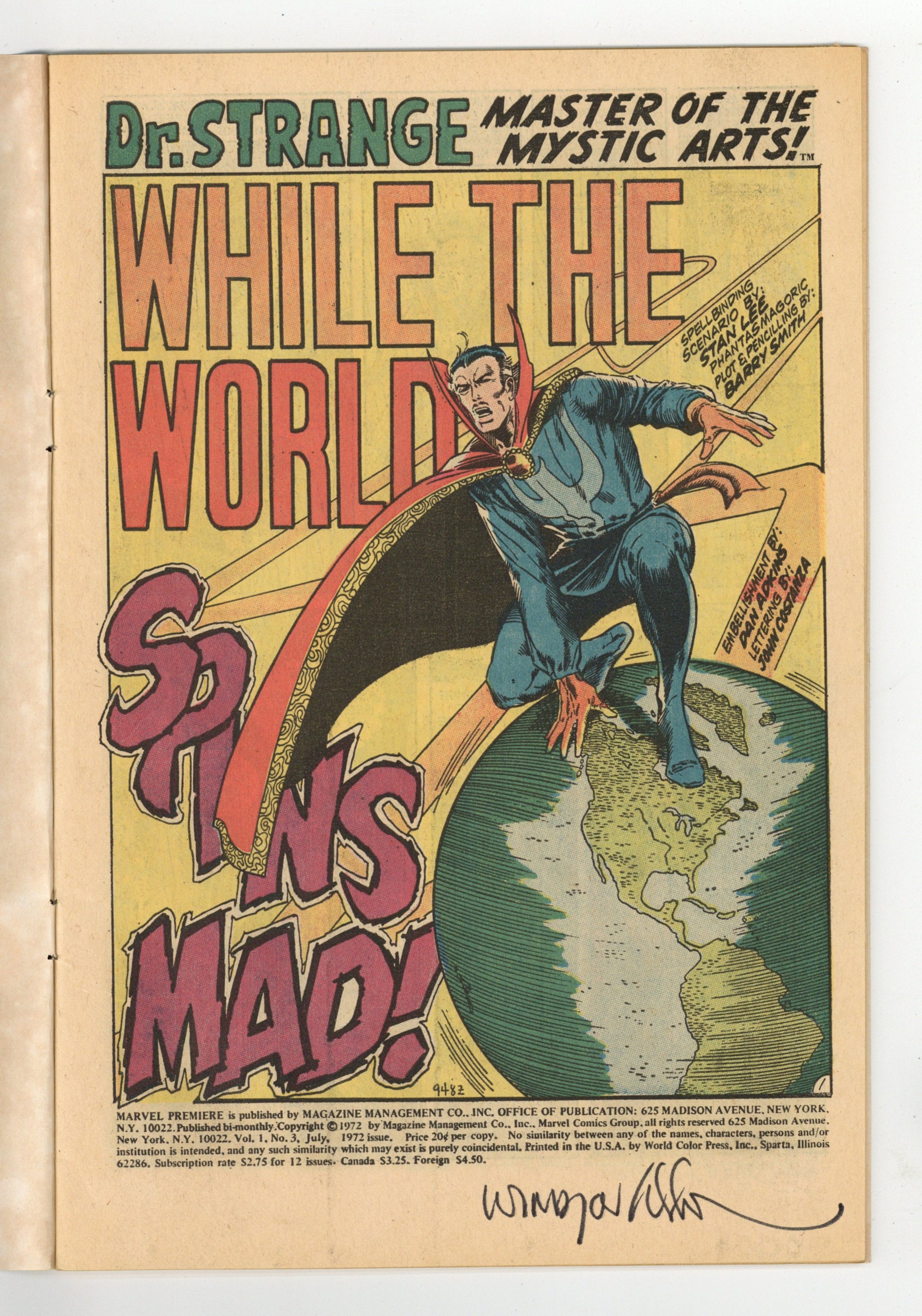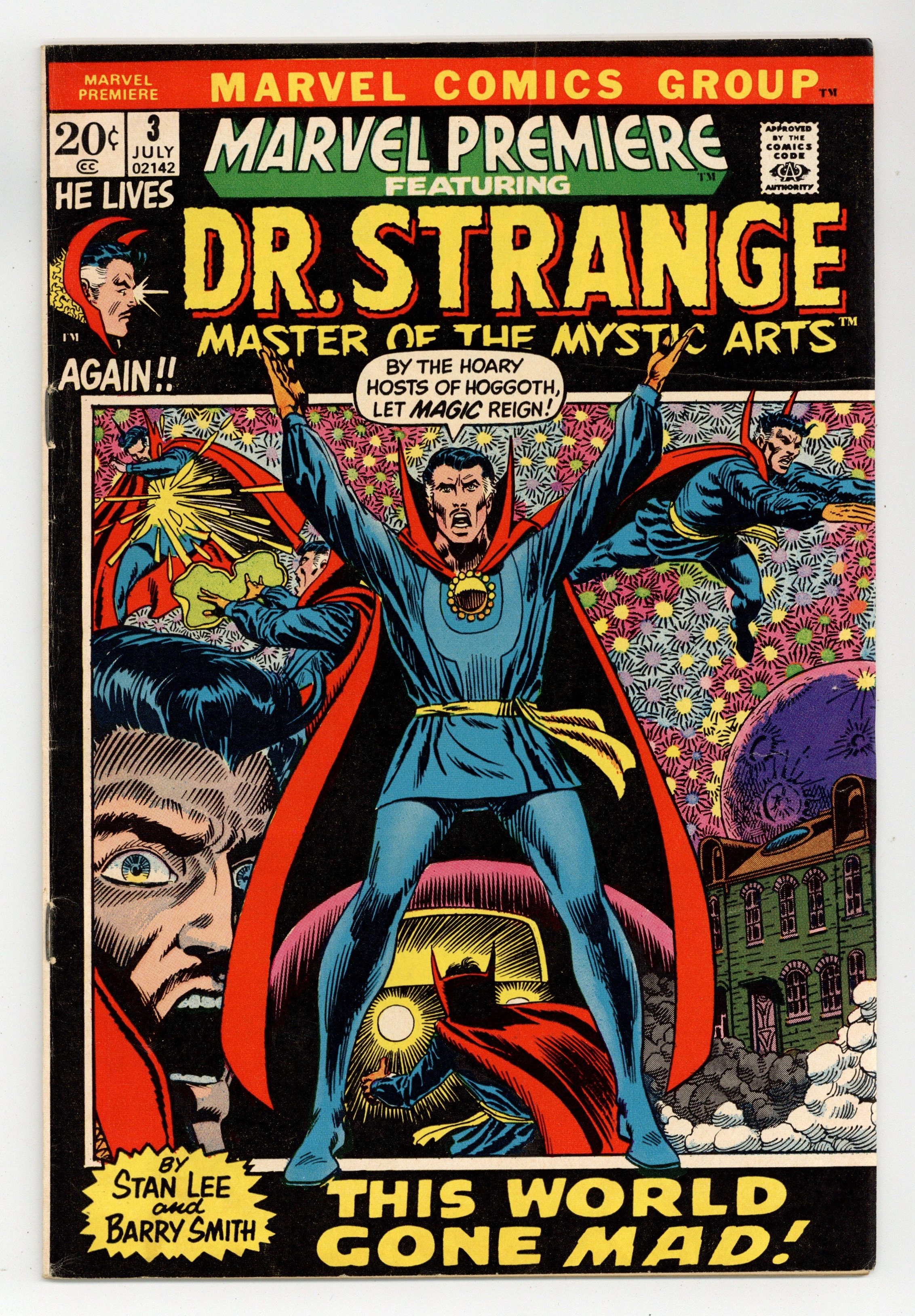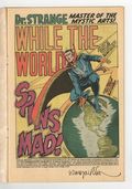 Starts Mar 23 Cover pencils by Barry Windsor-Smith, inks by Frank Giacoia. While the World Spins Mad!, script by Barry Smith (plot) and Stan Lee (dialogue), pencils by Barry Smith, inks by Dan Adkins; Sensing evil, Strange is so focused on seeking it out he's almost hit by a truck; He calls upon The Ancient One, who warns him of the nature of the evil, but is still mystified; Then he finds himself confronted by someone (or something) who takes his own form, and tells him he's "already defeated"; Only when he discovers his oldest enemy is at the bottom of it does he also realize he was hit by the truck--and has been in a hospital bed ever since!; On recovering, he erases the memory of the night's events from the doctor's mind, as "Many things there are that mankind must not know..." 36 pgs. $0.20. Cover price $0.20.
