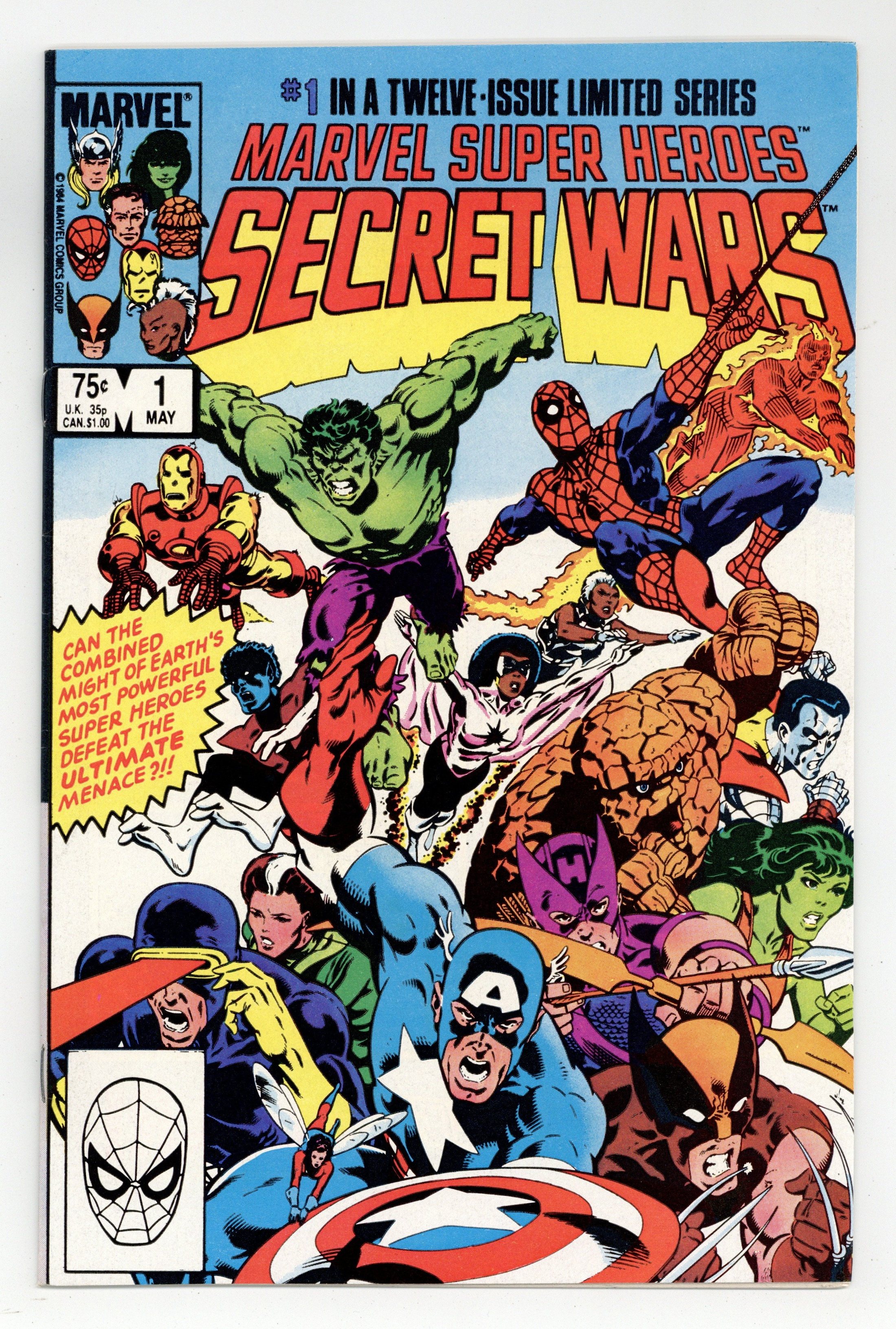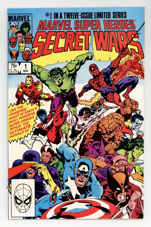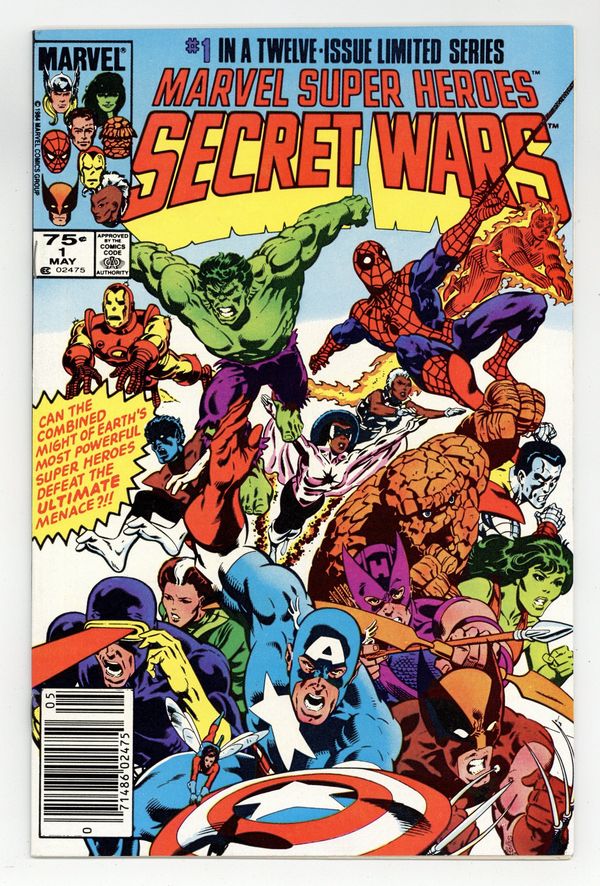 Starts Mar 23 Newsstand Edition. "The War Begins!" Part 1 of 12. Story by Jim Shooter. Art by Mike Zeck and John Beatty. This is it, the granddaddy of all epic events. Before Identity Crisis, Infinite Crisis, House of M, Civil War, and Infinity Gauntlet there was Secret Wars. A nigh omnipotent being from beyond has, for lack of a better word, kidnapped the greatest heroes and deadliest villains in the Marvel Universe and whisked them to the far side of the universe to battle for the ultimate prize. One thing is for certain, the lives of these heroes and villains will never be the same again. - This is the first printing. Any 2nd printing will have the words "Second Printing" at the bottom of the first page. NOTE: Nearly all first printings contain a "Blue Galactus" from a printing error (a lack of magenta printing plates) that was corrected in later printings. While small number of First printings may have the correct colors, the majority of copies will have "Blue Galactus". Due to the frequency, "Blue Galactus" variants should be treated the same as other First Printings. 36 pages, full color. Cover price $0.75.