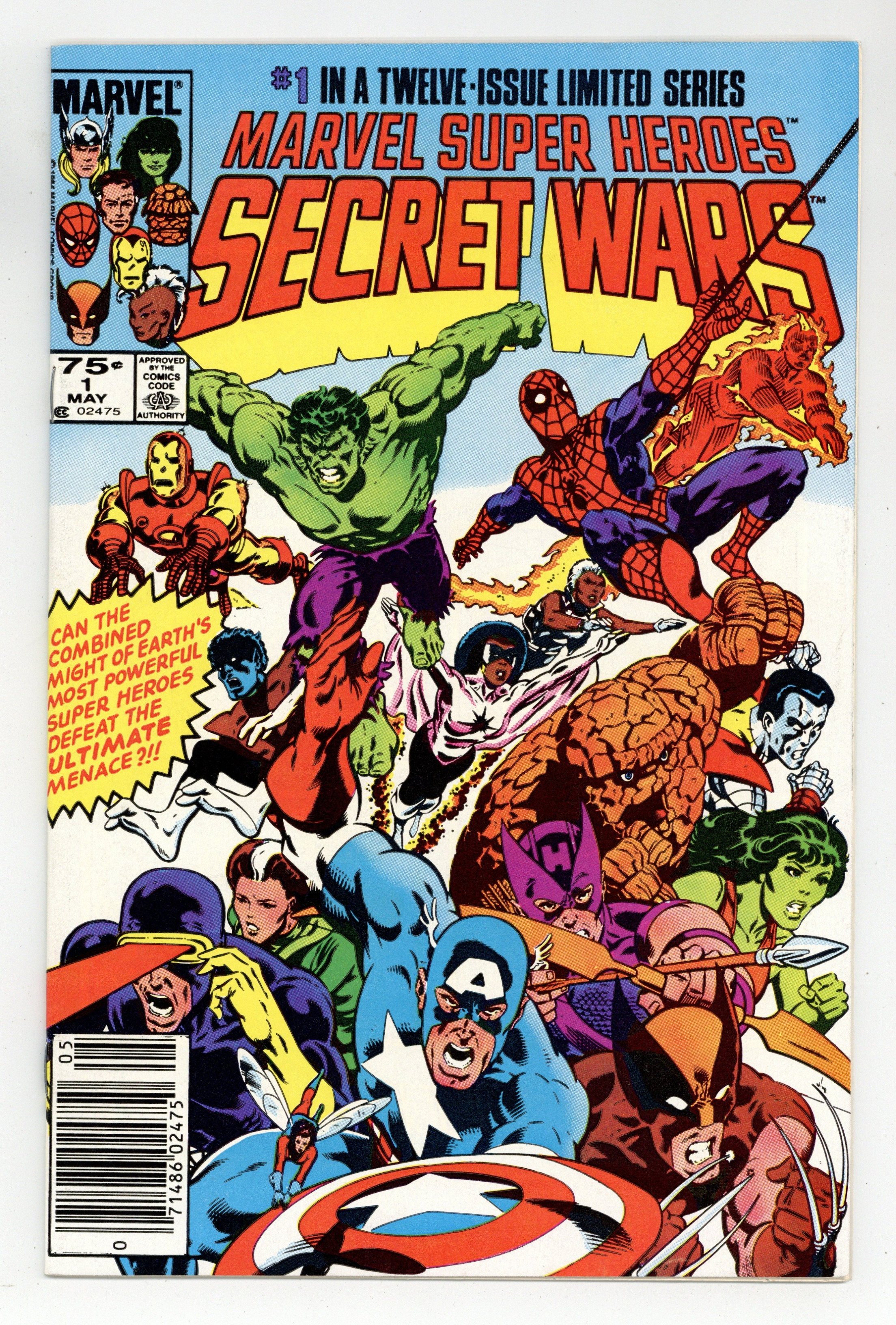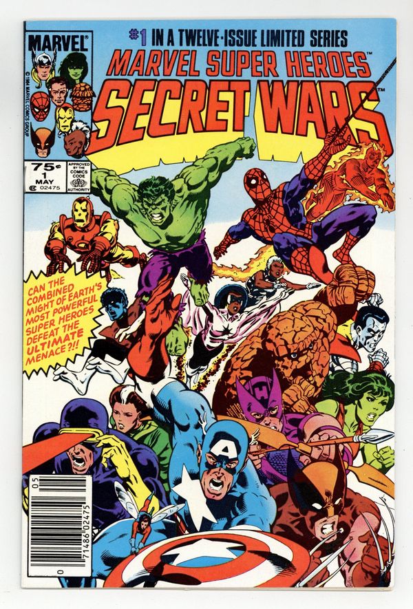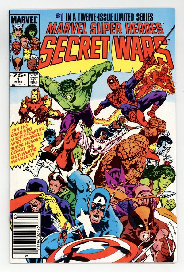 Starts Apr 20 Newsstand Edition. "The War Begins!" Part 1 of 12. Story by Jim Shooter. Art by Mike Zeck and John Beatty. This is it, the granddaddy of all epic events. Before Identity Crisis, Infinite Crisis, House of M, Civil War, and Infinity Gauntlet there was Secret Wars. A nigh omnipotent being from beyond has, for lack of a better word, kidnapped the greatest heroes and deadliest villains in the Marvel Universe and whisked them to the far side of the universe to battle for the ultimate prize. One thing is for certain, the lives of these heroes and villains will never be the same again. - This is the first printing. Any 2nd printing will have the words "Second Printing" at the bottom of the first page. NOTE: Nearly all first printings contain a "Blue Galactus" from a printing error (a lack of magenta printing plates) that was corrected in later printings. While small number of First printings may have the correct colors, the majority of copies will have "Blue Galactus". Due to the frequency, "Blue Galactus" variants should be treated the same as other First Printings. 36 pages, full color. Cover price $0.75.