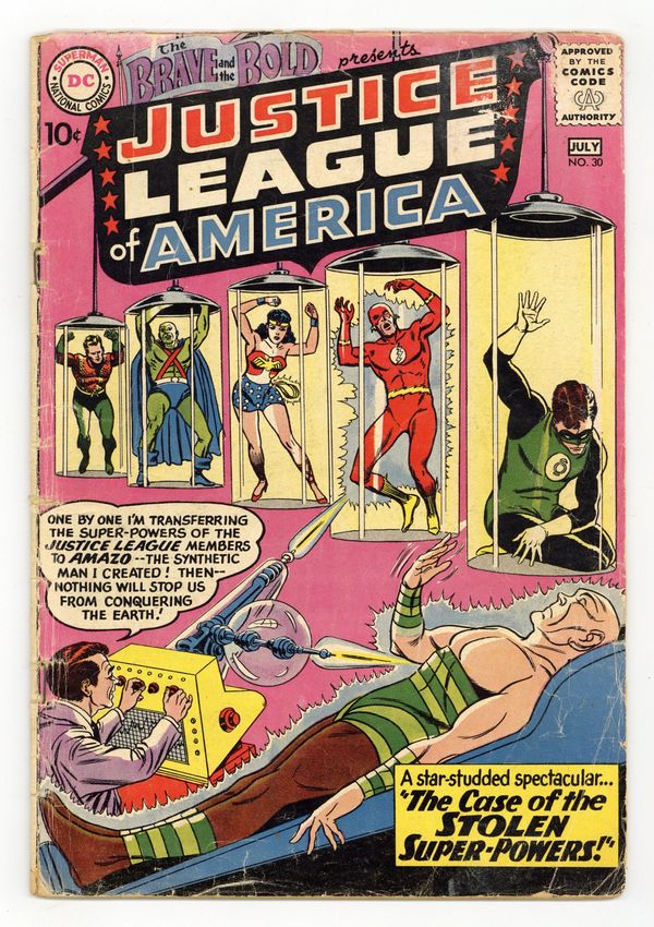 Starts Jan 3 1st appearance of Amazo - Cover by pencils Mike Sekowsky, inks by Murphy Anderson. Third appearance of the Justice League of America in "Case of the Stolen Super-Powers!", script by Gardner Fox, pencils by Mike Sekowsky, inks by Bernard Sachs; As several JLAers experience a sudden power loss, Flash finds that someone has used powers like theirs to steal a European catfish and a cicada; Snapper suggests the thefts have to do with someone researching immortality, and the JLA splits up to investigate other long-lived creatures; In every case, the JLAers come up against Amazo, who steals their powers, defeats them, and takes them to his creator's lab, where Professor Ivo is preparing an immortality serum; Green Lantern is able to use the weakness of his own ring against Amazo and Ivo, restore the JLA's powers, and defeat the villain. 36 Pages, Full Color. Cover price $0.10.