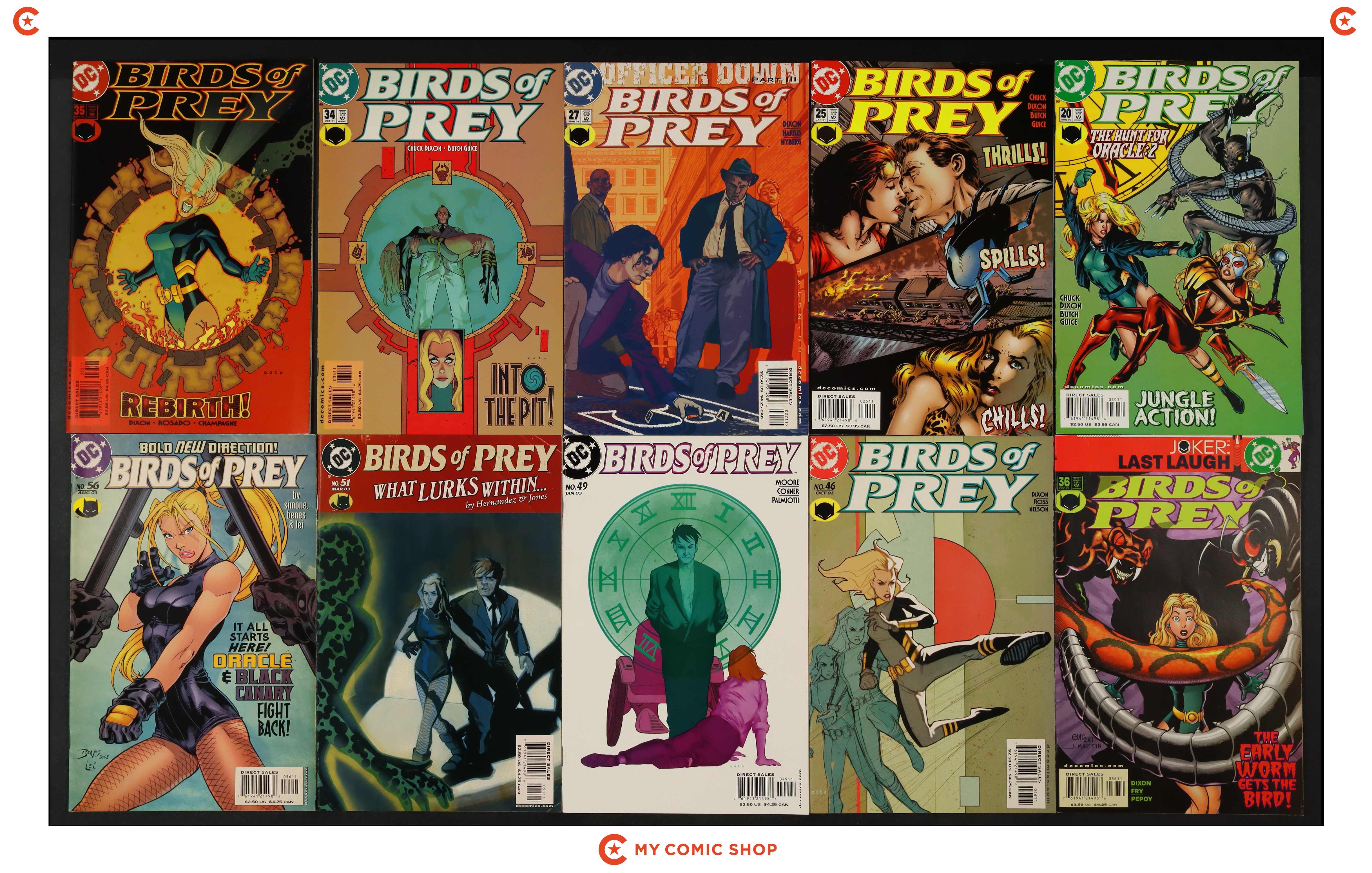Issues 20, 25, 27, 34, 35, 36, 46, 49, 51, and 56 of Birds of Prey (1999 1st Series). Most will grade in the VF to FN range.