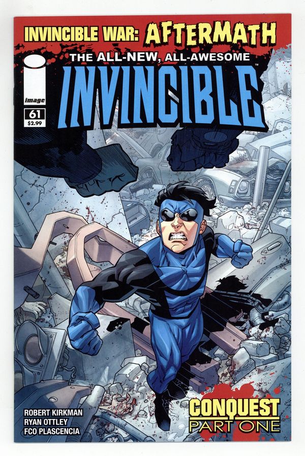 Starts Dec 8 INVINCIBLE WAR: AFTERMATH! The planet is in ruins. Everything has changed, the world's superheroes are in the hospital or dead. Invincible is left to rebuild - but now he must face his most deadly and powerful adversary yet. Who... or what is CONQUEST? Cover price $2.99.