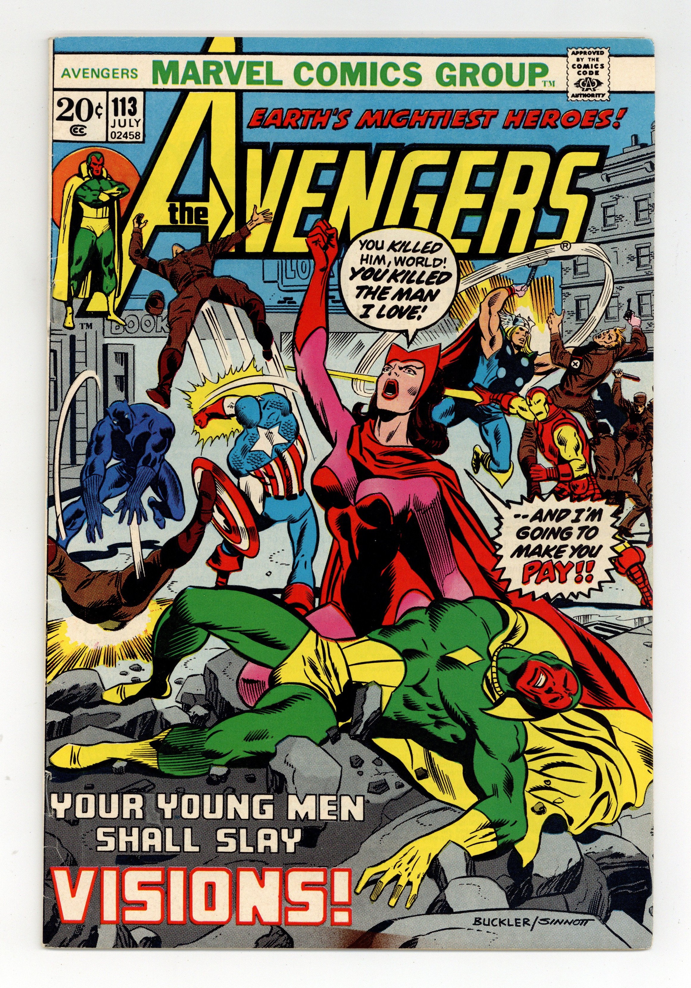 Starts Later today "Your Young Men Shall Slay Visions!" Script by Steve Englehart. Pencils by Bob Brown. Inks by Frank Rolle. Cover by Rich Buckler and Joe Sinnott. The Vision and the Scarlet Witch have made their love for one another known to the general public! How will the outside world react to a mutant and a synthezoid involved in a relationship? Regrettably, not very well. After Wanda and the Vision are spotted kissing atop the Statue of Liberty, a bizarre group of domestic terrorists devises a plot to kill the Vision! What is the method for their madness? Suicide bombing. The terrorists' first bombing attempt doesn't slay the synthezoid avenger but leaves him seriously wounded. Iron Man takes the Vision to Stark Industries' Long Island plant where Dr. Donald Blake, Tony Stark, and T'Challa work to repair their critically injured teammate! Leaving Captain America and the Scarlet Witch to stave off the terrorists' second bombing run! It's a desperate fight for survival for Earth's Mightiest Heroes! Cameo appearances by Mantis and the Swordsman. Avengers Lineup: Black Panther, Captain America, Iron Man, Scarlet Witch, Thor, and the Vision. (Note: This issue was published in 1973 and may have been ahead of its time.) 36 pages Cover price $0.20.
