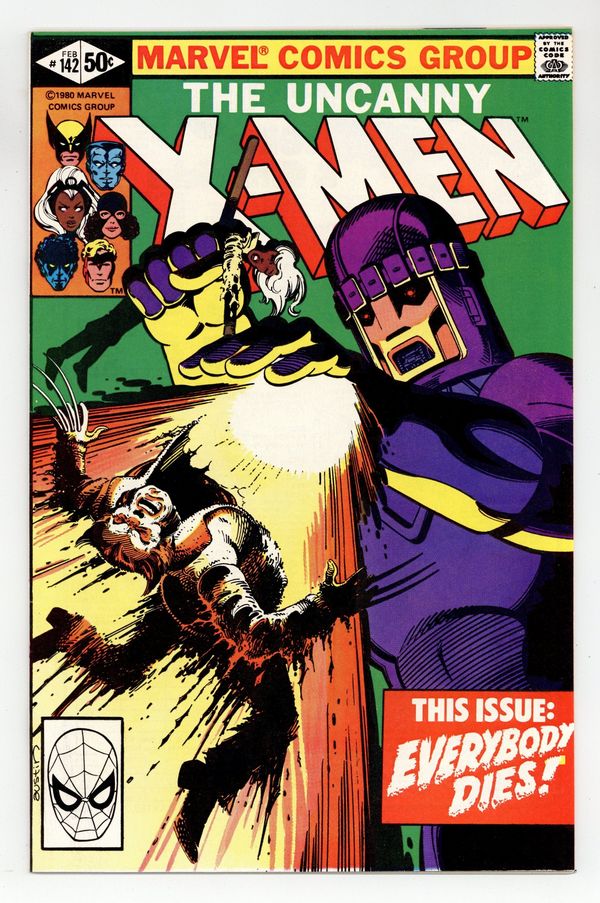 Starts Feb 23 Direct Edition. Days of Future Past: Part 2 of 2. "Mind Out of Time!" Story by Chris Claremont and John Byrne. Art by John Byrne and Terry Austin. Cover by Terry Austin. In order to prevent a dystopian future where all mutants and super-heroes are hunted and killed by the robotic Sentinels, the X-Men must prevent the new Brotherhood of Evil Mutants from assassinating Senator Kelly. Featuring one of the most shocking death scenes in the comic book history. NOTE: Uncanny X-Men #123 and #142 are rare commodities in the realm of comics as they are two of the very few covers where inker extraordinaire Terry Austin actually does the pencils as well. - Odinson Lone Star Comics Archivist. 36 pgs. Cover price $0.50.