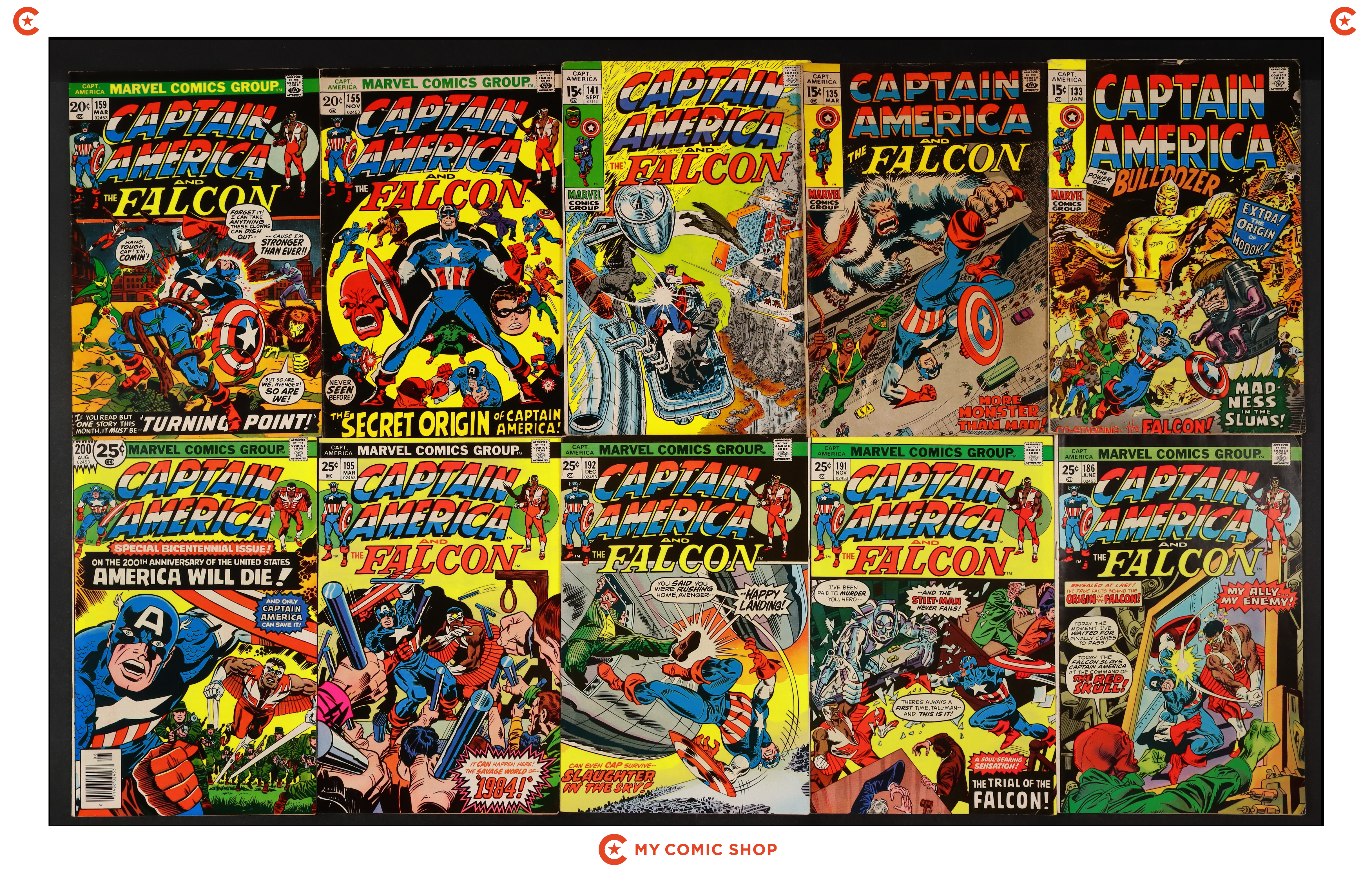 Issues 133, 135, 141, 155, 159, 186, 191, 192, 195, and 200 of Captain America (1968 1st Series). Most will grade in the FN to VG range.