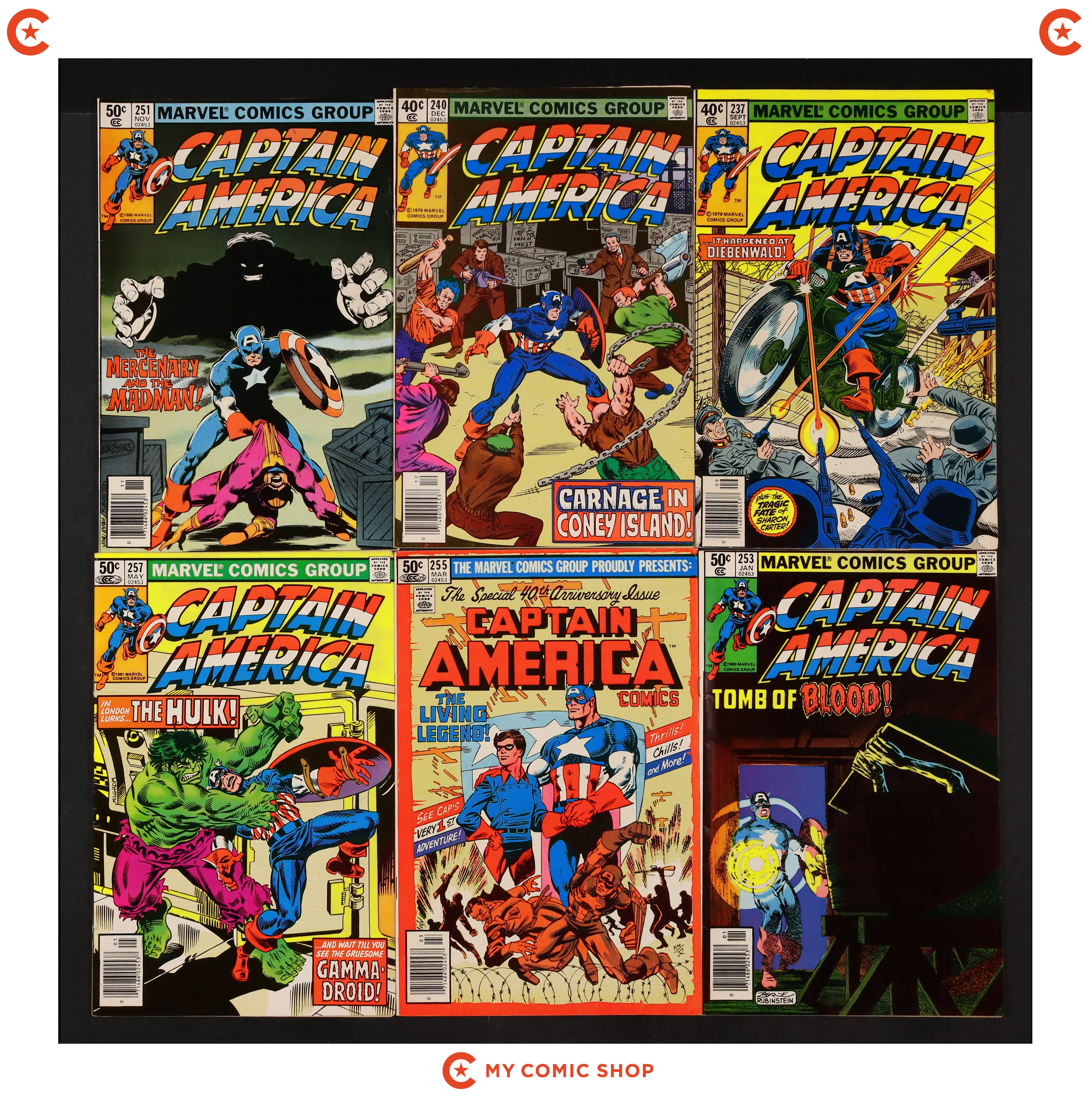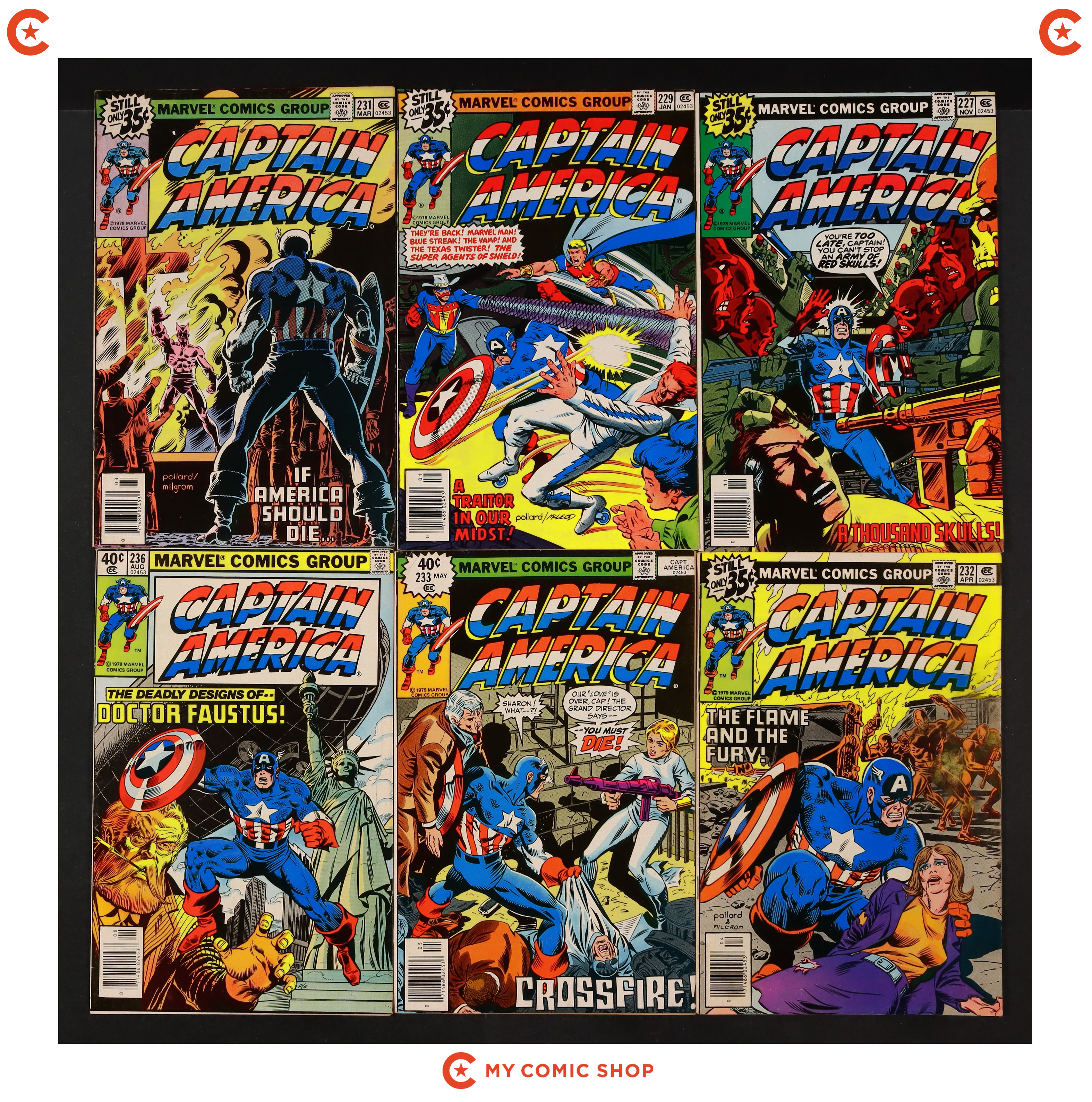 Issues 227, 229, 231-233, 236N, 237N, 240N, 251N, 253, 255N, and 257 of Captain America (1968 1st Series). Most will grade in the FN range with a couple grading VG and #237 grading PR (piece missing, affect story and art).