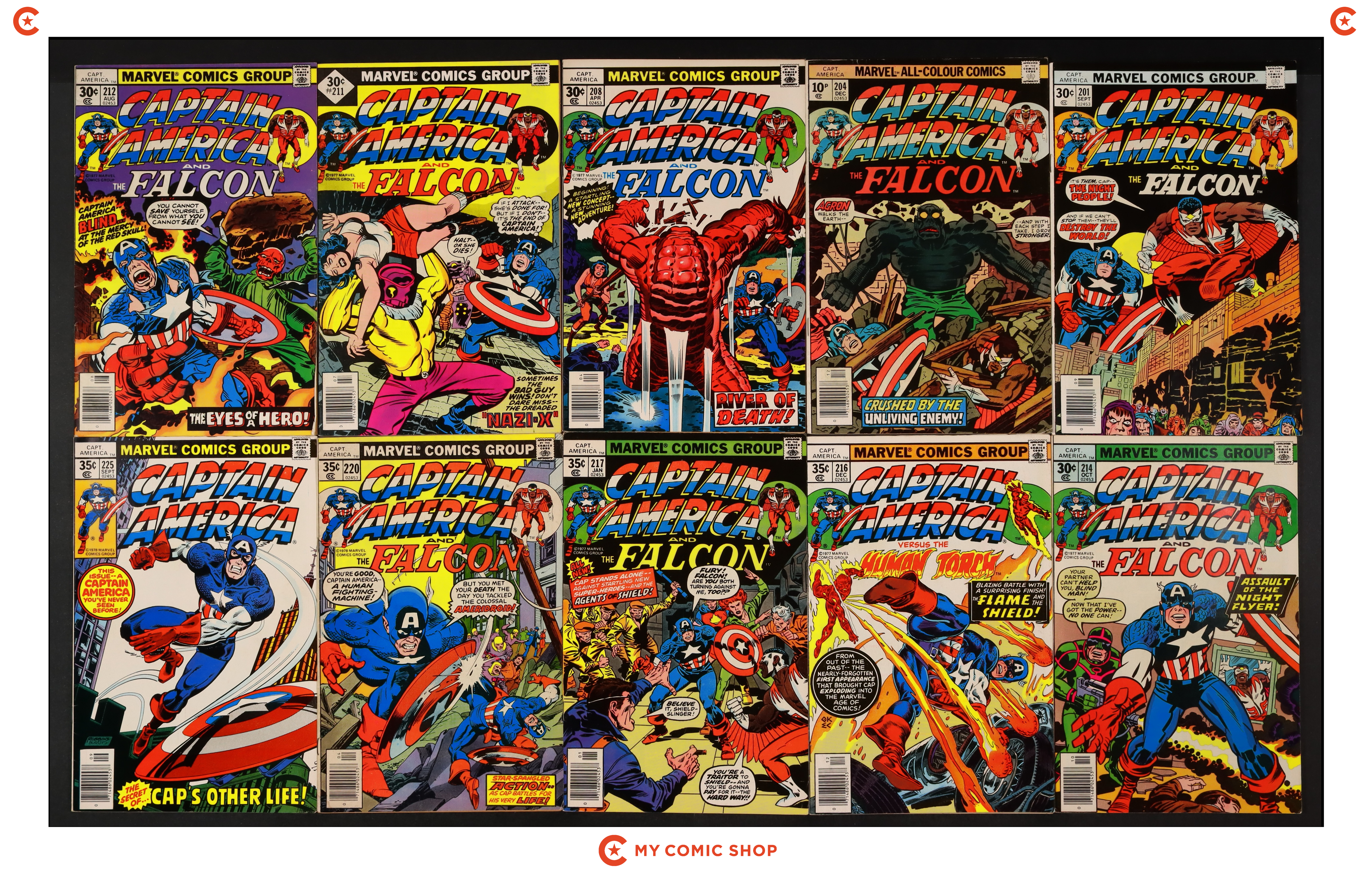 Issues 201, 208, 212, 214, 216, 217, 220, 225, 226, 233, and 240N of Captain America (1968 1st Series); 204UK of Captain America (1968 1st Series) UK Edition; and 211 of Captain America (1968 1st Series) Whitman Variants. Most will grade in the FN range with a few grading VG.