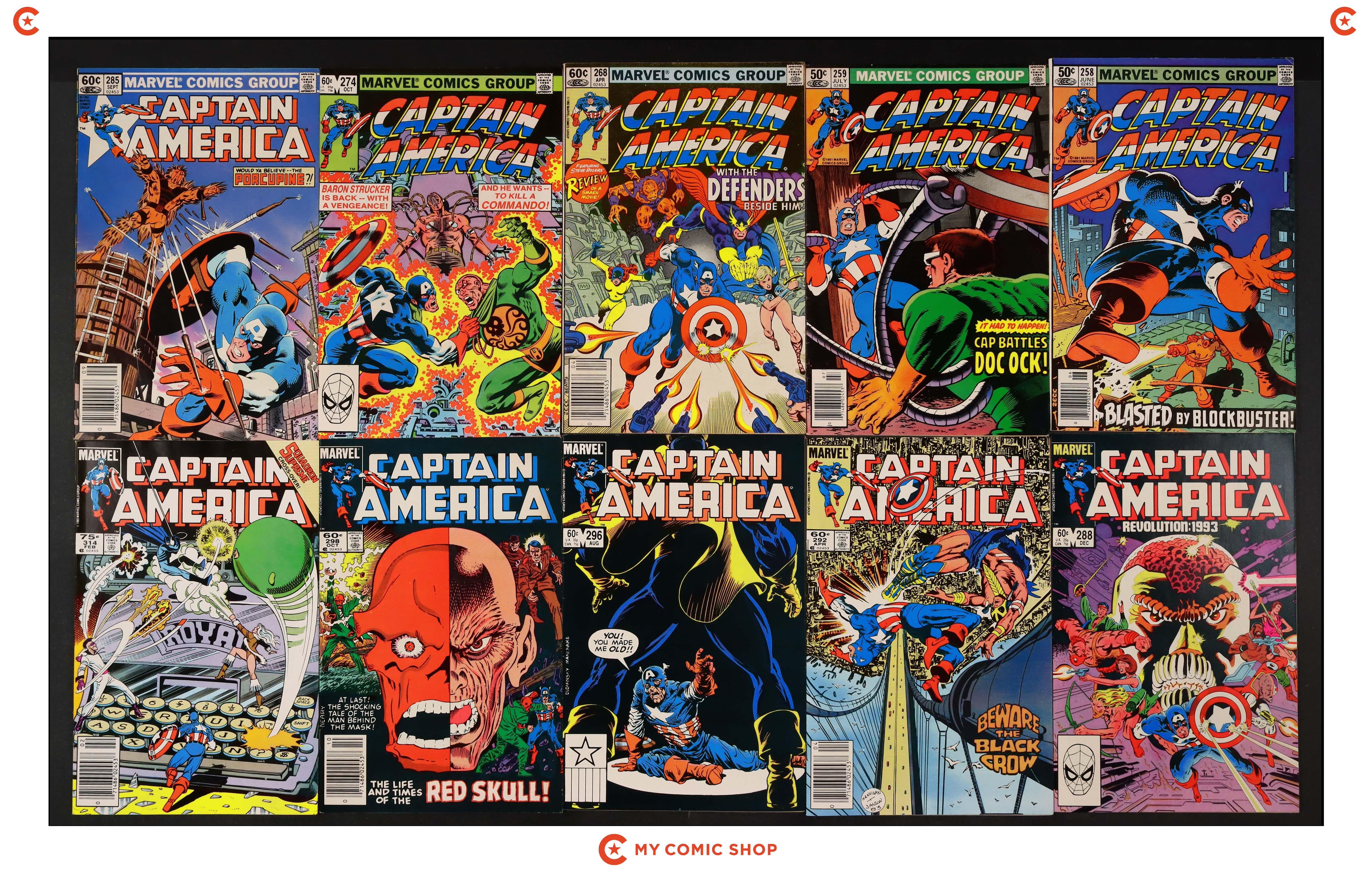 Issues 258N, 259, 268N, 274, 285, 288, 292, 296, 298, 314-317, and 321 of Captain America (1968 1st Series); and 5 of Captain America (1968 1st Series) Annual. Most will grade in the FN range with some grading VF.