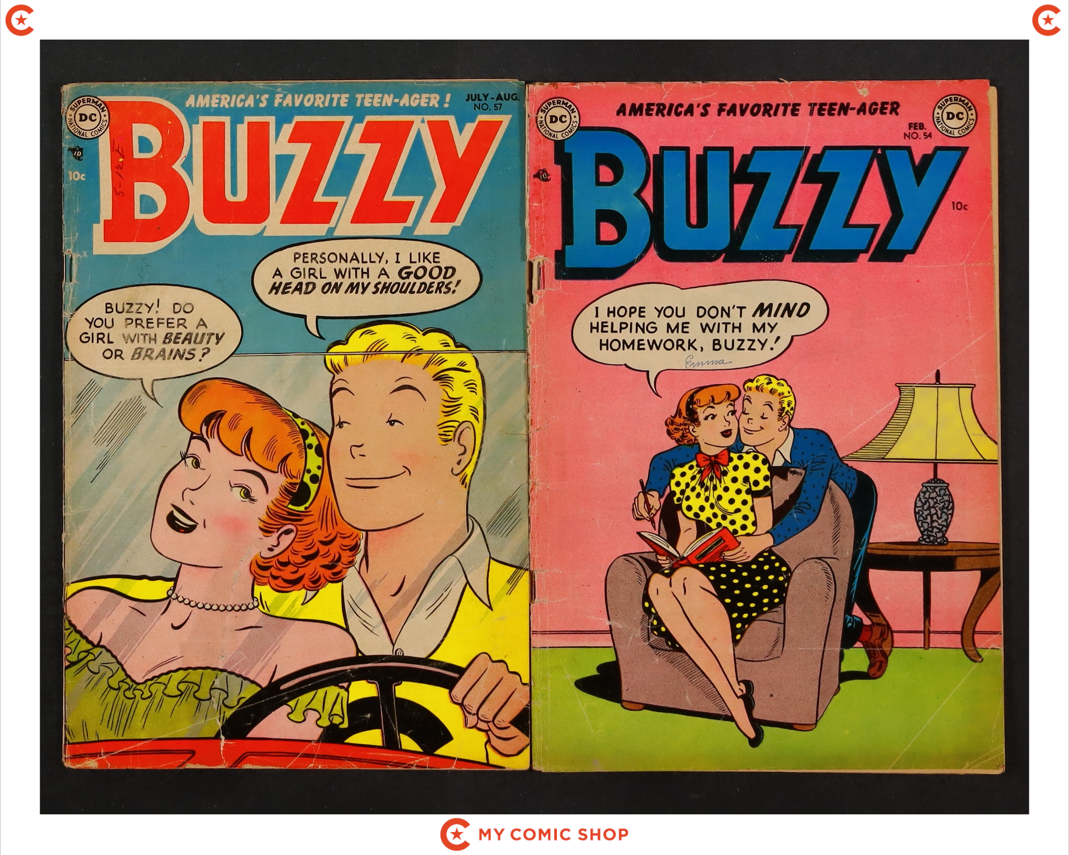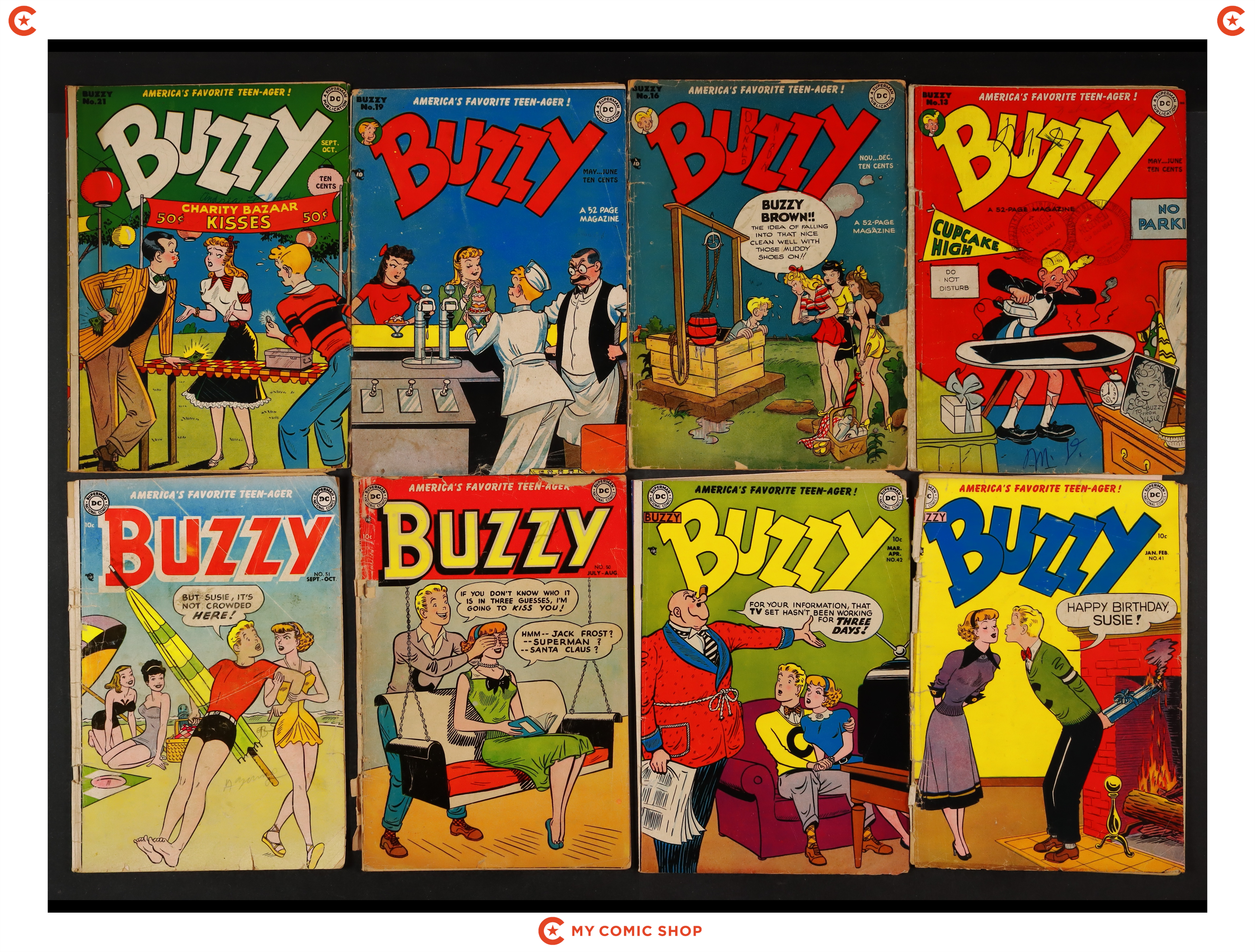 Issues 13, 16, 19, 21, 41, 42, 50, 51, 54, and 57 of Buzzy (1944). Most will grade in the GD range with a couple grading FR and #13 and #51 grading PR (#13-centerfold missing, affect story and art; #51-page missing, affect story and art).